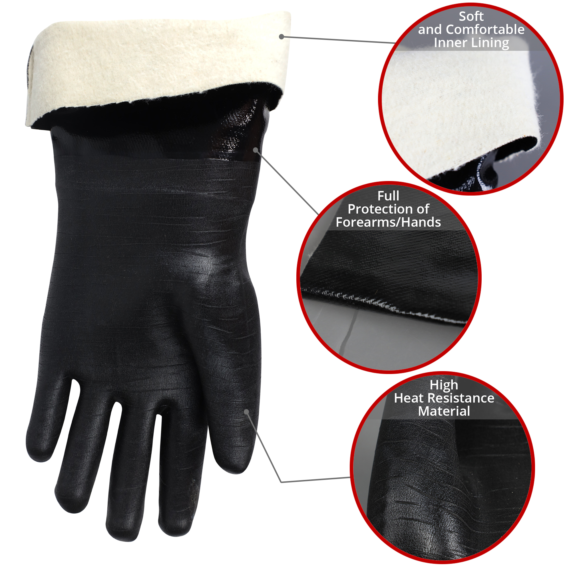 YOU WILL FEEL LIKE A REAL PIT MASTER WITH THESE PROFESSIONAL GLOVES. The Pit Glove is a soft jersey cotton liner double coated in neoprene with a full 13" length to protect your forearms. We added a textured palm to provide you an excellent grip. The gloves are waterproof and resistant to staining, grease & flames. The Pit Glove can easily manage BBQ sessions or prepare hot food in the kitchen while keeping your hands safe and dry in an easy to clean glove. We designed the PIT GLOVE after studying the gloves that Pit Masters and BBQ experts everywhere were wearing and then made them better. We found that neoprene offered better protection and insulation from heat and was more resistant to fire than the other materials available. The neoprene stays flexible and offers superior dexterity over silicone or rubber while the jersey cotton liner is soft on your hands. Also, the neoprene coated cotton liner let’s your hands breath so you stay comfortable at the grill. – The PIT Glove easily handles Grill, Smoker and BBQ temperatures.