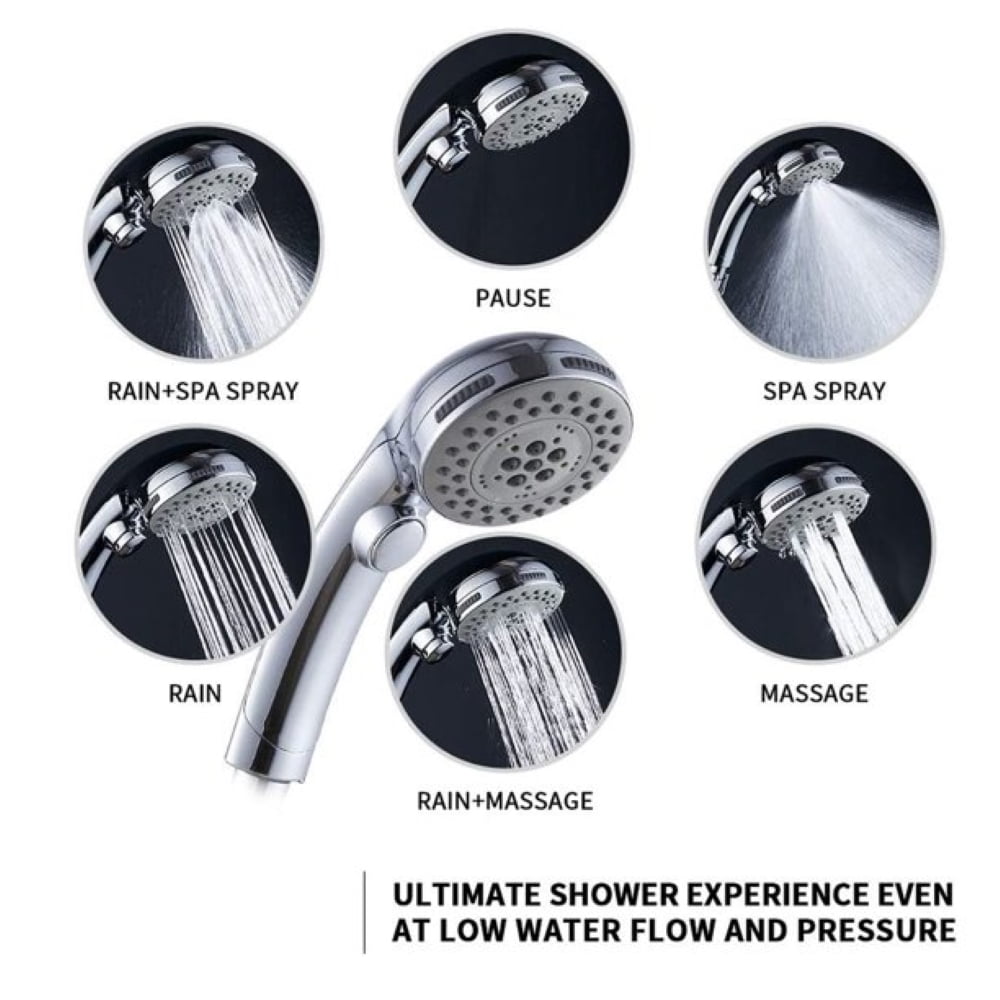 Shower head has 5 different spray patterns which make pressure boosting effect for ultimate shower experience even at low pressure. Settings include Rain+Massage, Rain, Massage, Mist, Spray, Pause mode.