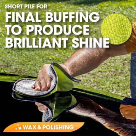 - Ultra fine microfiber with special dual weave. Long pile (grey) side for residue removal, and short pile (lime) side for superior buffing
