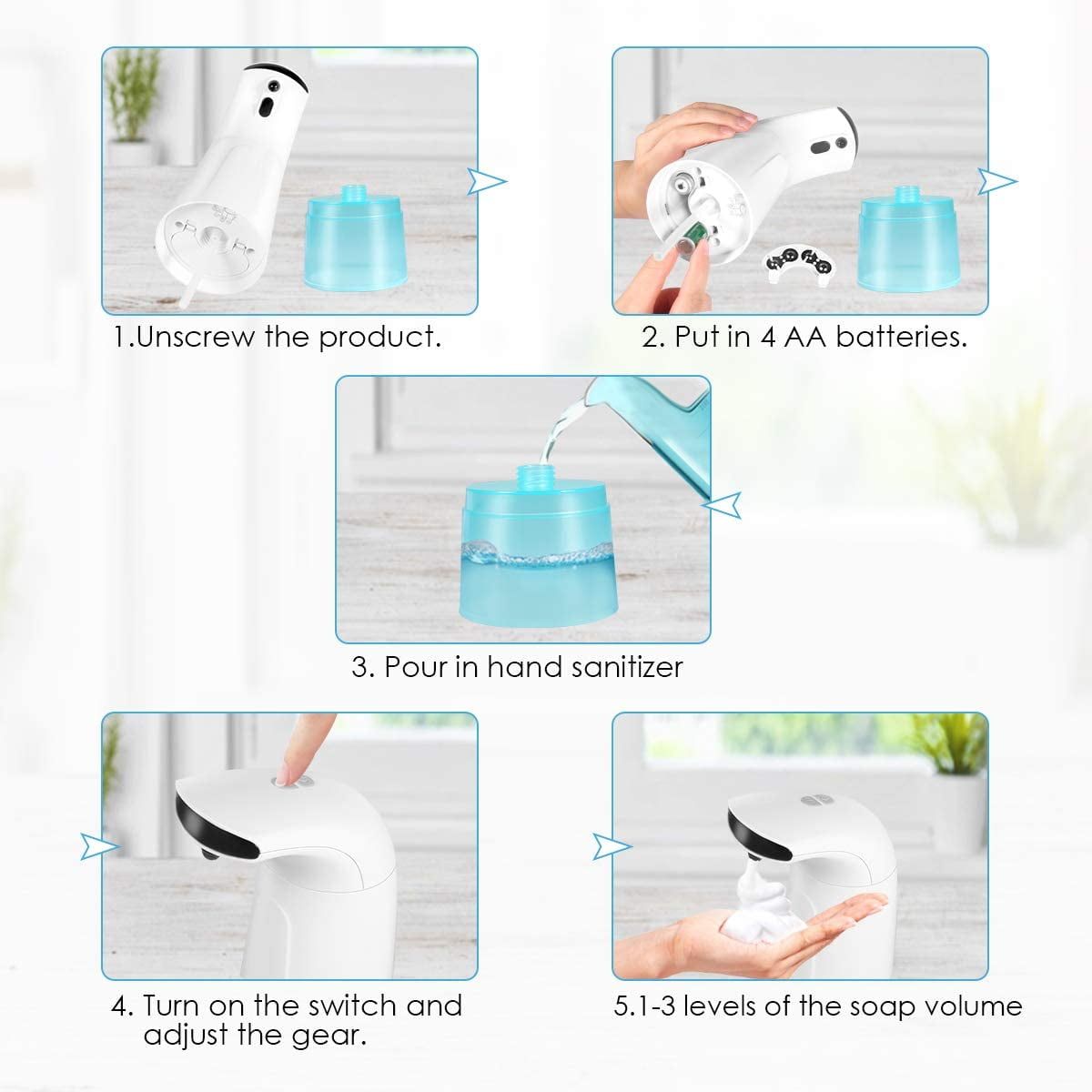 Please install the batteries as the illustrated. on the top of the automatic hand sanitizer dispenser, there are 2 adjustment buttons for pressing to control the foam output more or less.