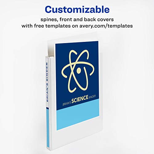 The Avery Economy View 0.5 inch binder is a basic binder that exceeds expectation.Unlike other basic binders, this Economy binder is fully adhered with a deep-weave polypropylene cover that is resistant to bubbling and surface wrinkles.It also has a textured pattern that is tear-resistant. The interior of this binder is just as impressive as its exterior.With back-mounted rings, your pages will never curl again.Pages lay flat and are easy to turn, while the cover opens and closes without pulling on your papers.Enjoy extra organization and storage capabilities with two interior clear pockets made of nonstick material that won’t lift or transfer ink from your documents. This classic white Economy binder is perfect for light usage like filing important documents or building a presentation book.Each binder holds up to 100 sheets of paper with 0.5 inch capacity rings.Rings are standard 3-hole spaced and accommodate 8.5" x 11" pages nicely.All Economy binders are made with PVC-free material.Personalize your view binder using the free templates, fonts, and designs at avery.com/templates.