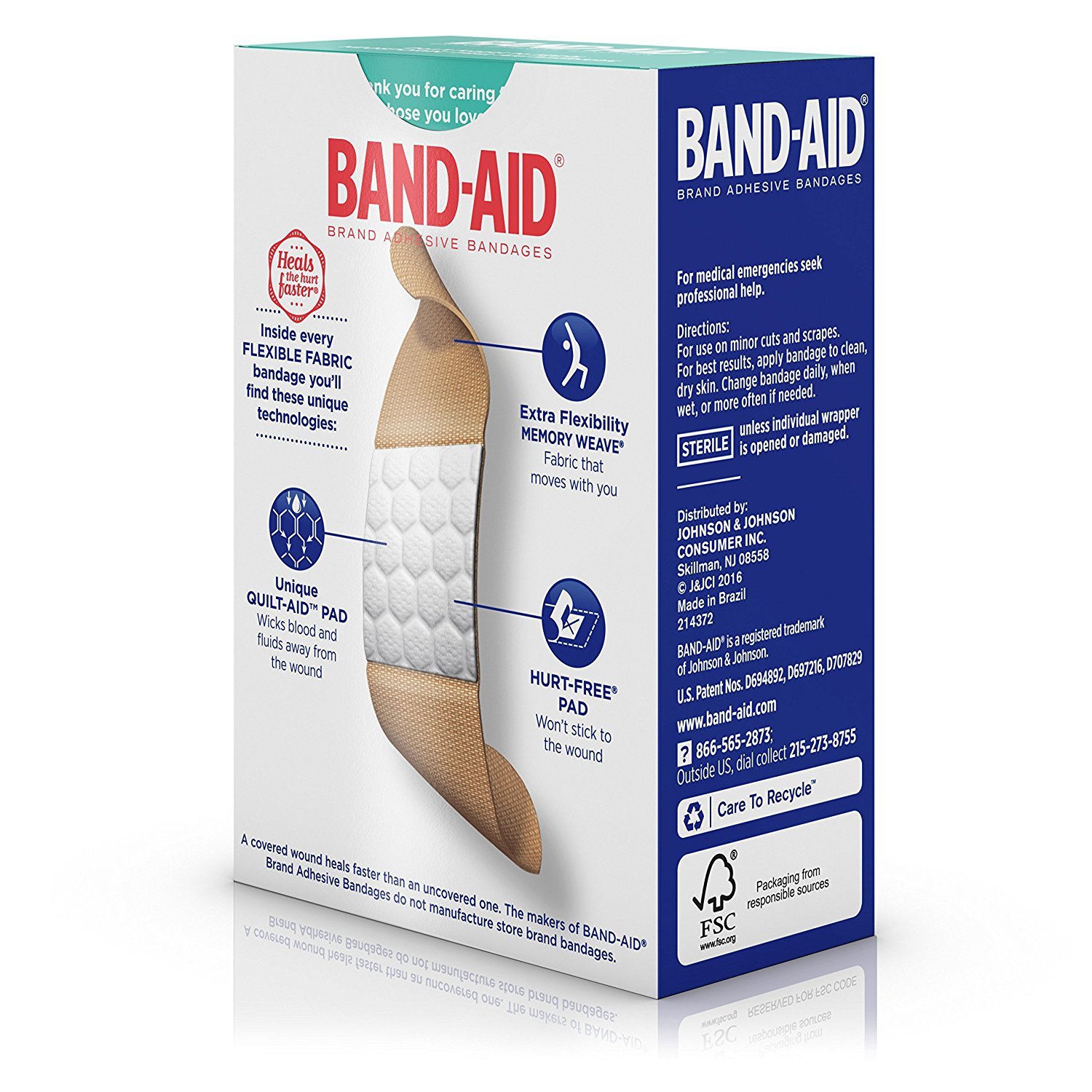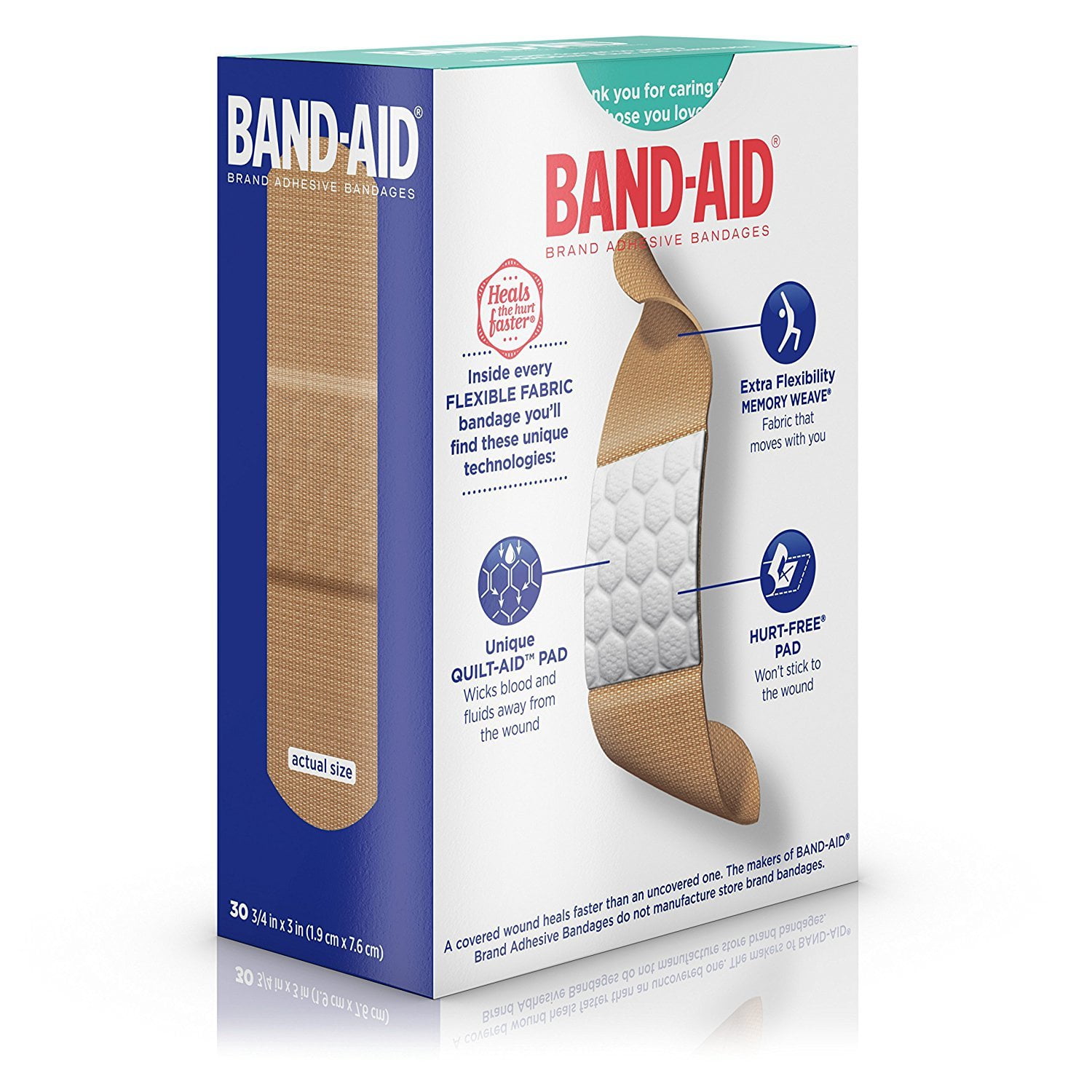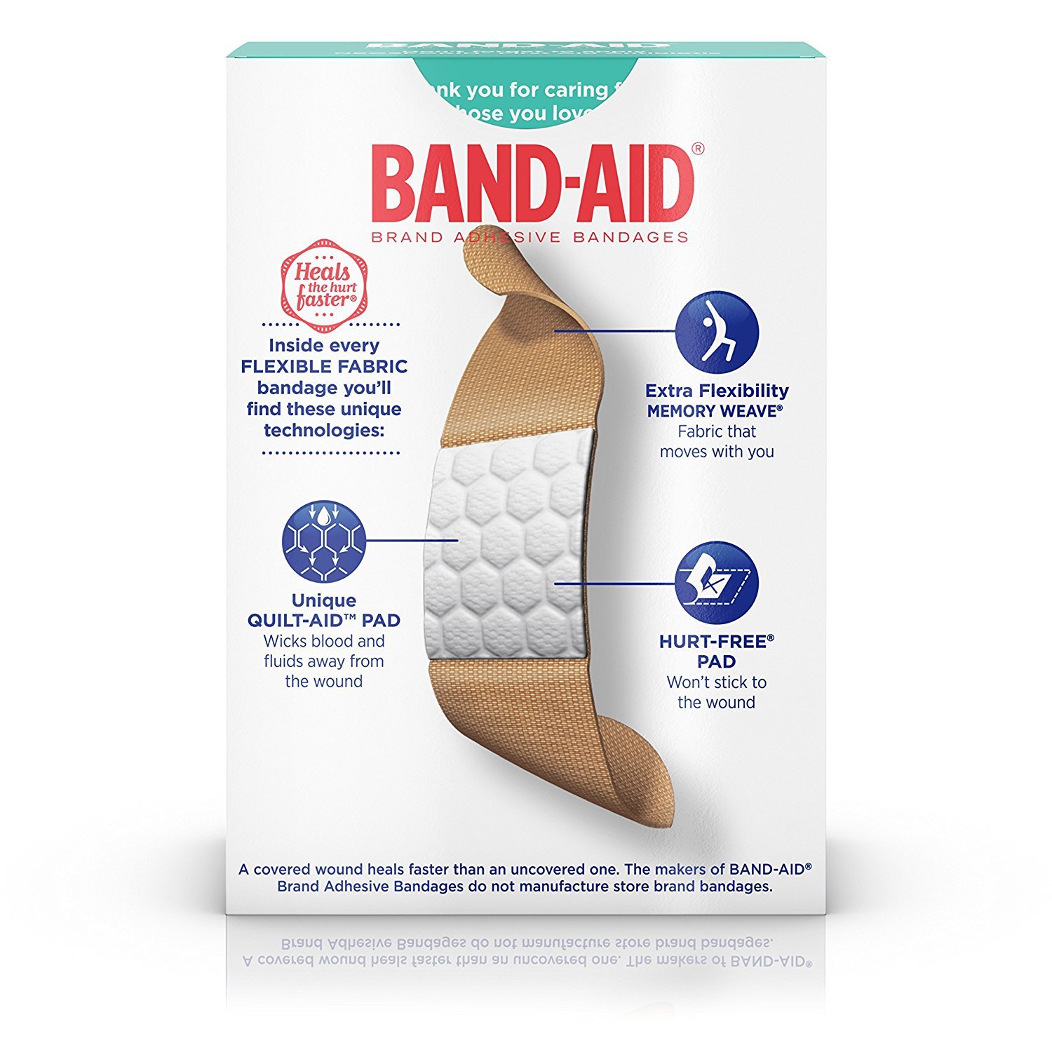 Band-Aid Brand Flexible Fabric Adhesive Bandages cover and protect minor wounds. Made with Memory-Weave fabric for flexibility, these bandages move with you throughout your day. The pad features QuiltVent pad air channels to improve breathability and wicks away blood to keep minor wounds clean. The full-width pad fits most minor wounds and is nonstick for gentle removal. This package contains eight bandages, each measuring .75 by 3 inches.