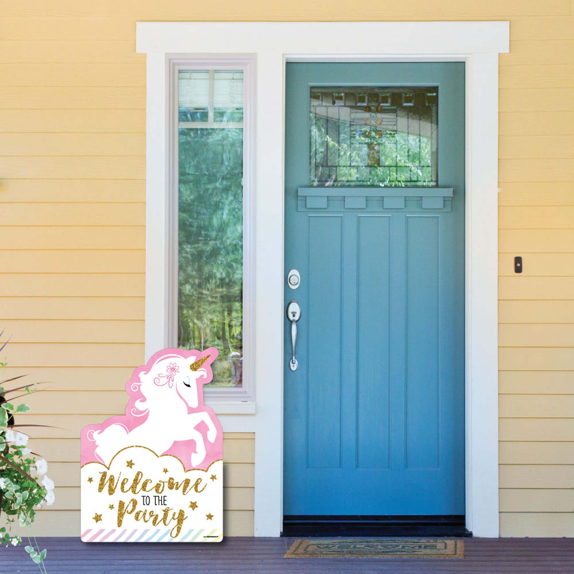 - PERFECT FOR ANY LOCATION! Rainbow Unicorn Yard Sign SIZE 17 inches wide x 23 inches tall. Vibrant glitter unicorn yard decor is an easy way to decorate for baby shower or birthday party. Both adults and kids will love these unicorn party supplies. Display in front yards of your home or party venue.