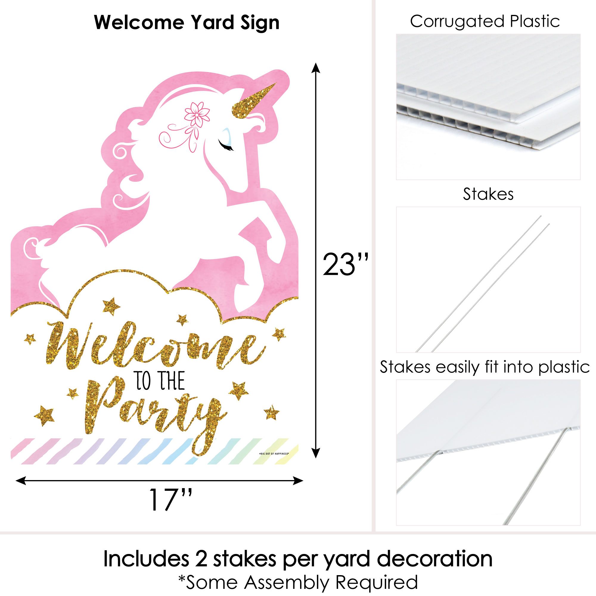- EASY TO USE: Magical Unicorn Lawn Decorations are professionally printed and cut, making assembly quick and easy. Simply insert two heavy-duty metal stakes into each baby shower or birthday yard ornament and press into the ground to display.