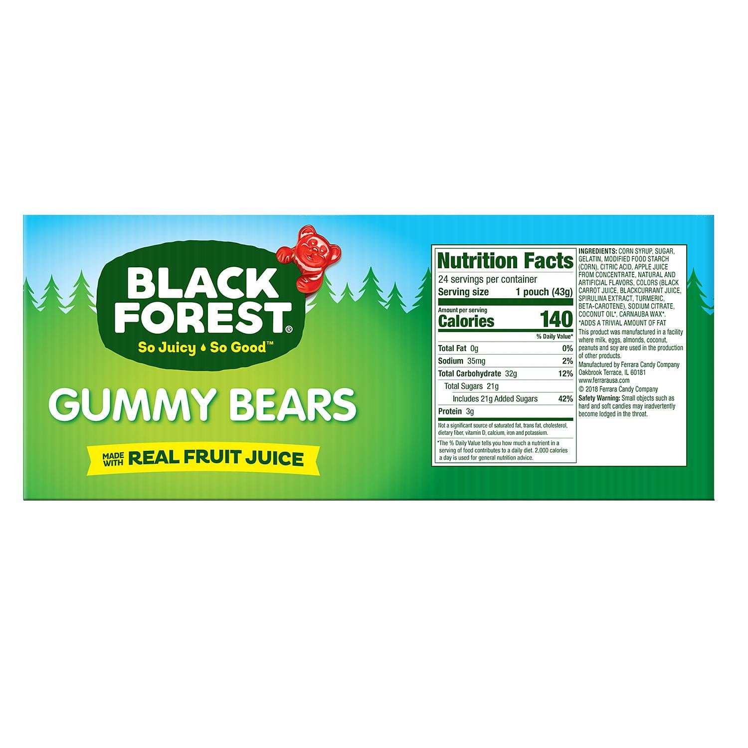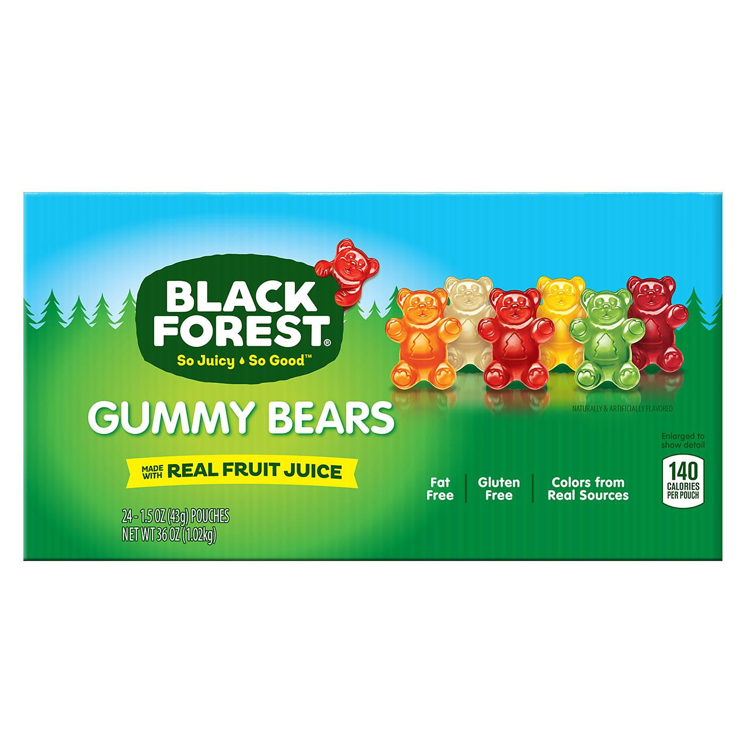 Black Forest Gummy Bears are made with fruit juice and colors from real sources. Enjoy the delicious assortment of apple, cherry, lemon, orange, pineapple, and strawberry flavors. They’re also fat free and come in a variety of great fruity flavors. Each one is as delicious as the next. No wonder they’re a fan favorite!Black Forest Gummy Bears, 1.5 Ounce (24 Count)