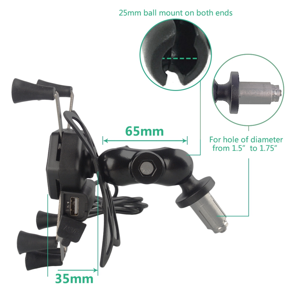 This motorcycle phone mount with charger fits for installing in the 1.6-2cm triple tree stem yoke center hole for any motorcycle.