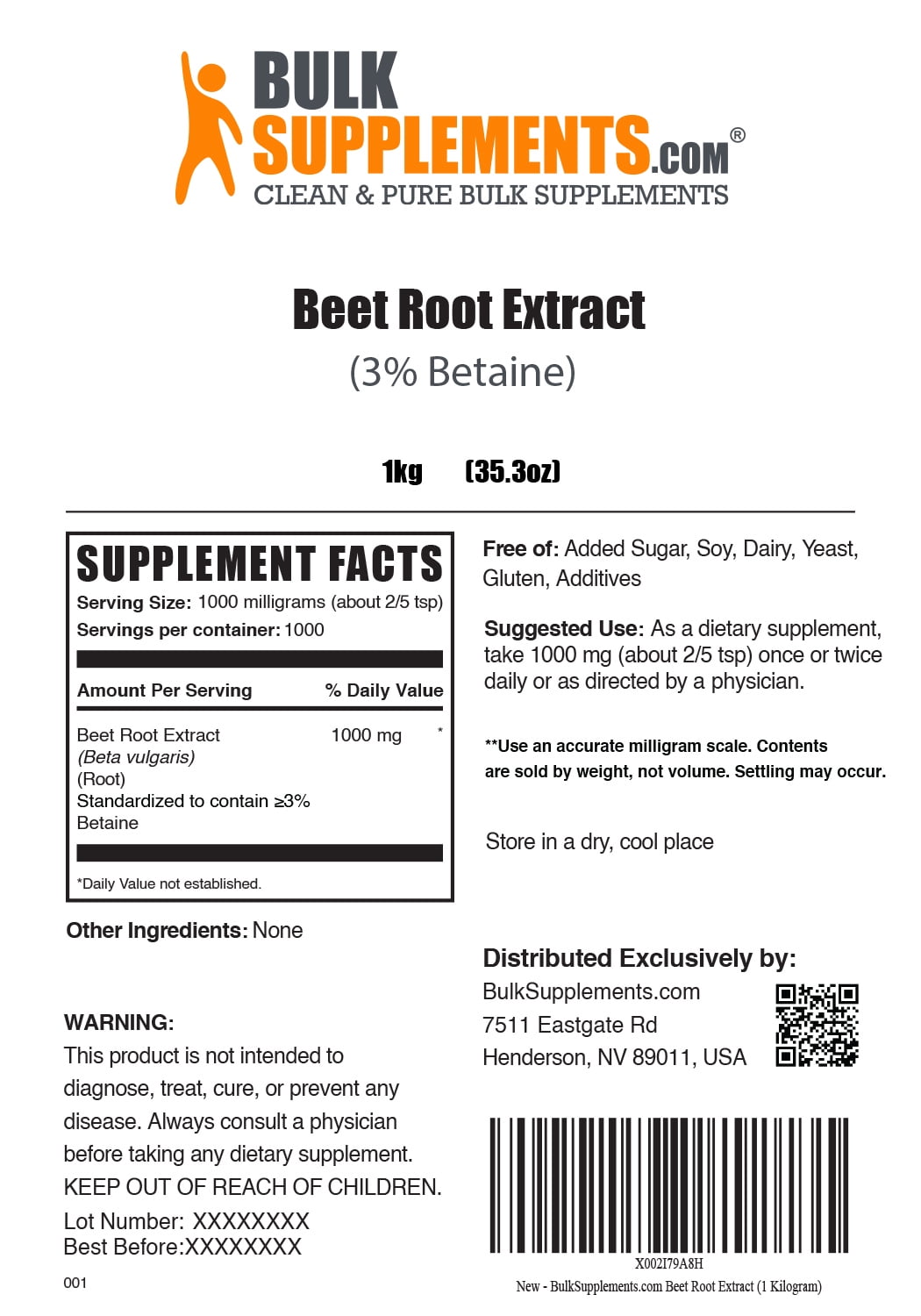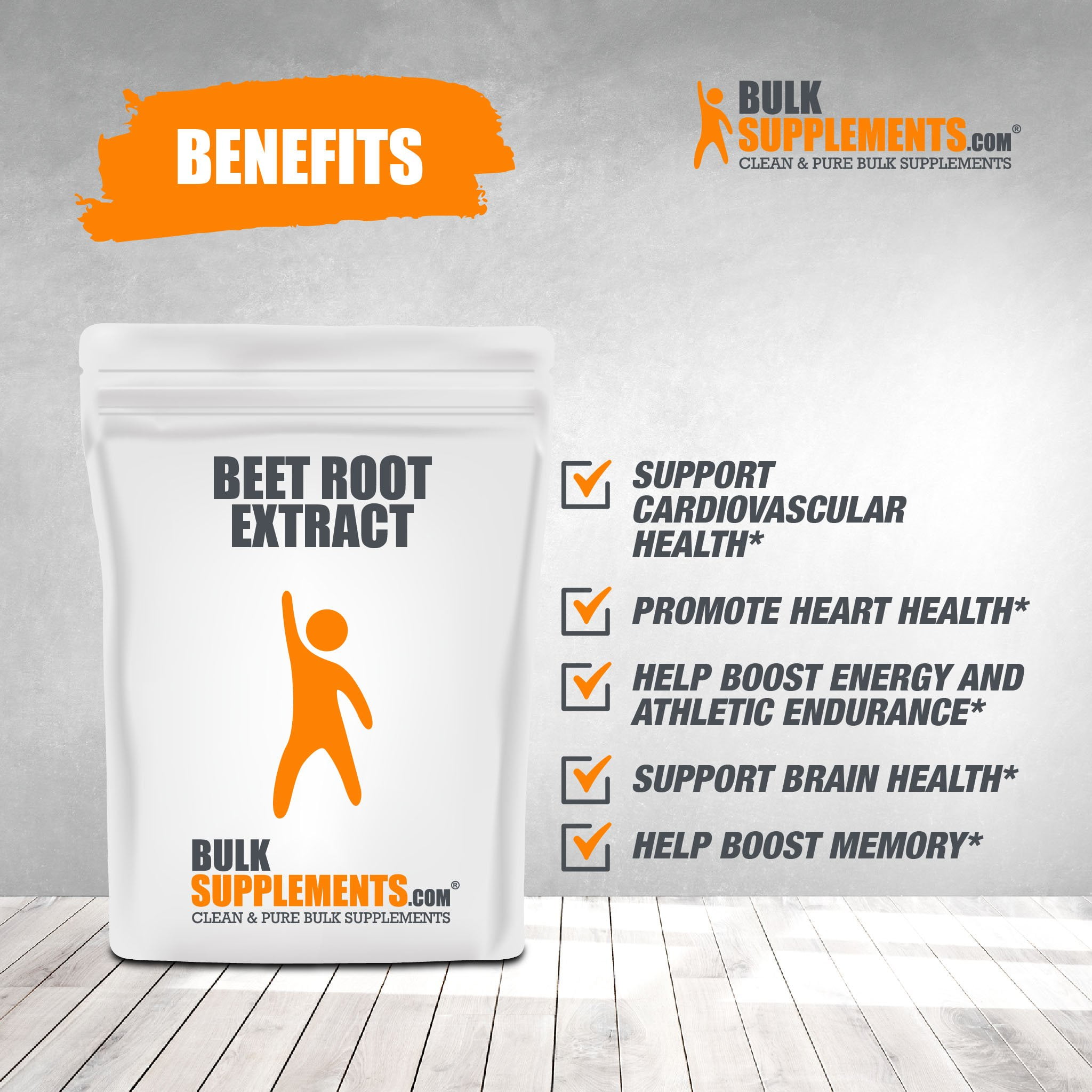 Beet root extract may help support cardiovascular system and the heart.† It may help maintain blood pressure when taken in conjunction with diet and exercise.† It may also help boost energy and assist with athletic endurance.† Beet root may promote brain function and help boost memory and cognition.† It may help support sexual wellness and help boost libido.† Beet root is high in antioxidants, especially Alpha Lipoic Acid, and may help fortify the immune system and support overall wellness.† This beet root extract contains 3% betaine.