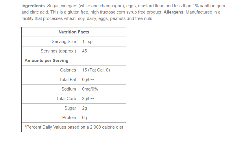 - Ingredients: Sugar, vinegars, eggs, mustard flour, and less than 1% xanthan gum and citric acid.