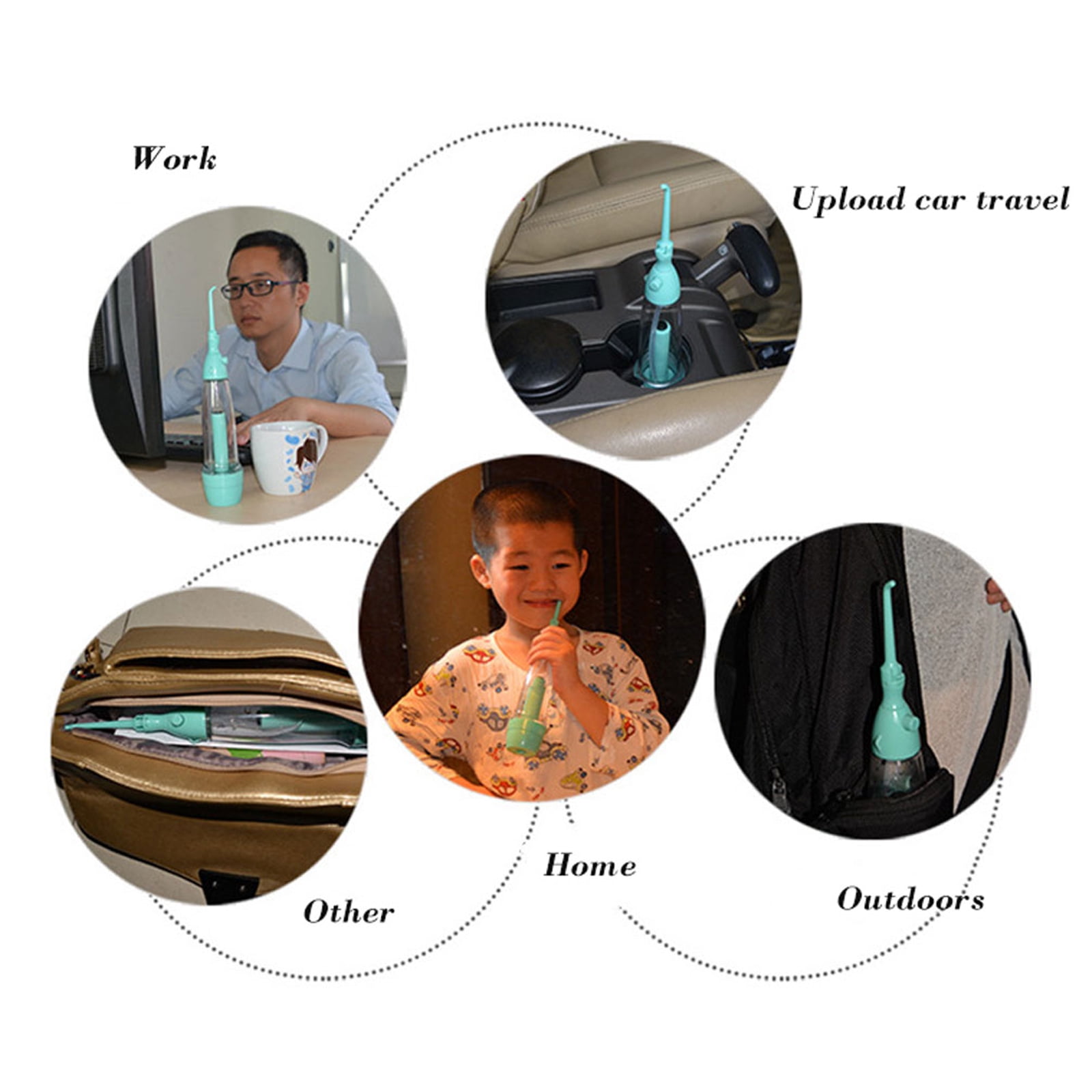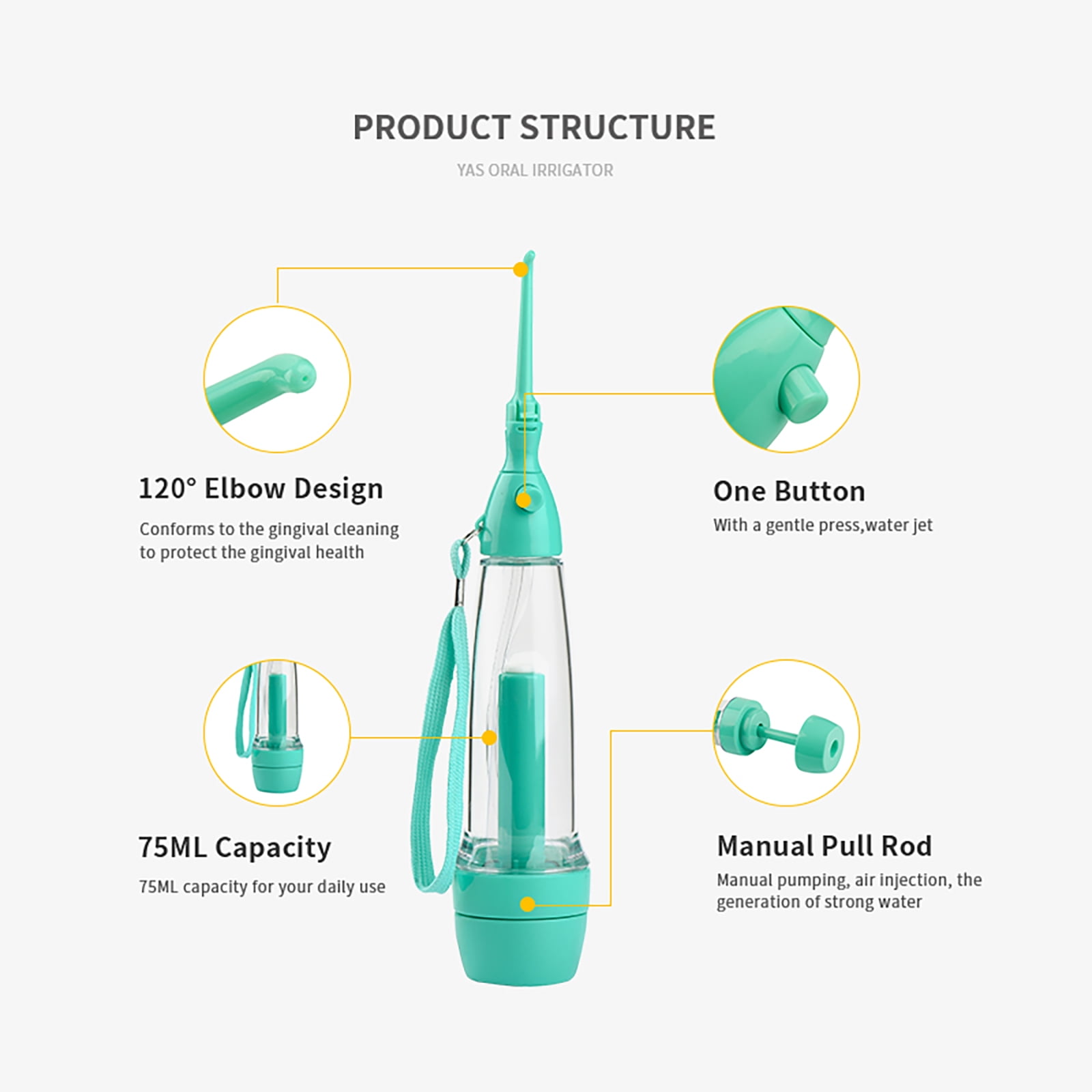 Our manual water flosser provides an easy and effective way to support healthy teeth and gum. Using air infusion technology to propel the water stream, it effectively blasts away food debris on and in between your teeth, prevents tartar, soothes sore gums, flushes out tonsil stones, and reduces the formation of periodontitis. The slightly angled nozzle is also perfect to reach the tonsil crypts and remove tonsil stones or flush out dental cavities. Irrigating teeth and gum is less abrasive than string flossing. You can also add a little mouthwash into the jet for a cleaner feeling. The portable jet flosser also works great with those who have braces, bridges, implants and are unable to floss as effectively. Regular irrigation will assist in the prevention of gum disease and improve your dental and oral hygiene. Always use the irrigator after brushing your teeth.