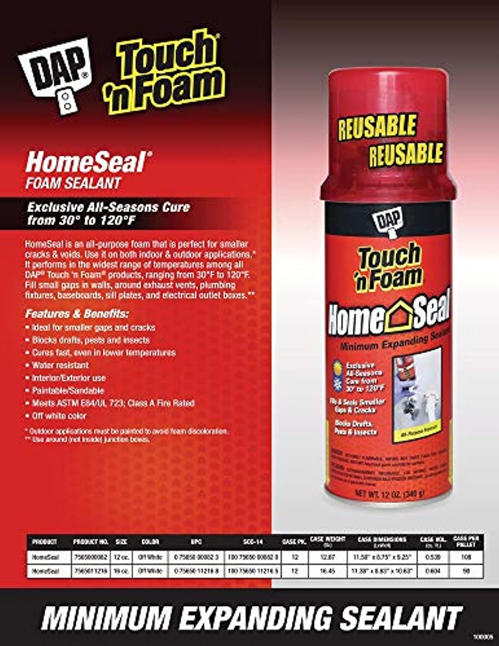Touch ‘n Foam Home Seal Foam Sealant is an all-purpose, minimum expanding foam sealant designed to fill smaller cracks and voids in both indoor and outdoor applications. It can be used to fill small gaps in walls, around exhaust vents, plumbing fixtures, baseboards, sill plates, siding edges, skylights and more.