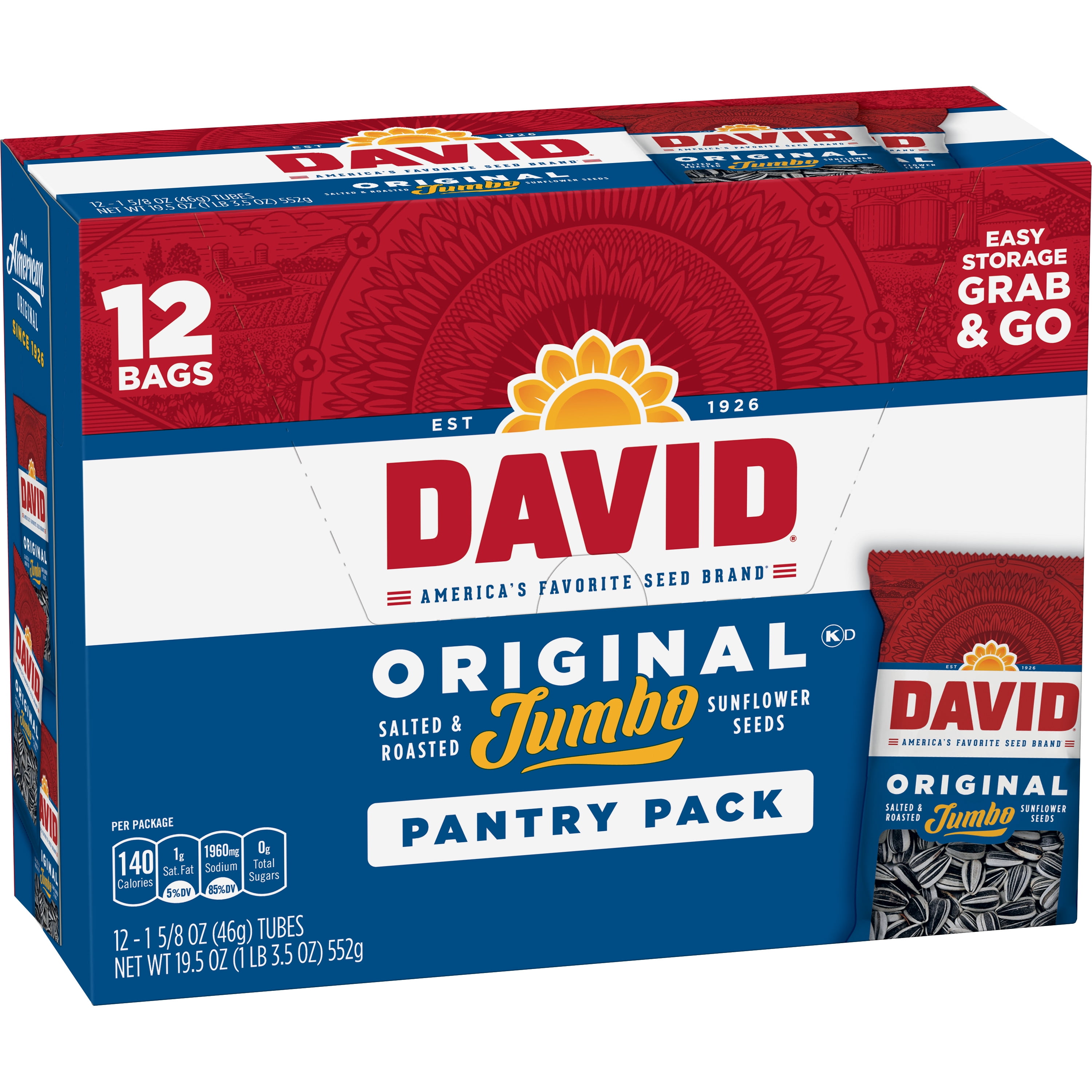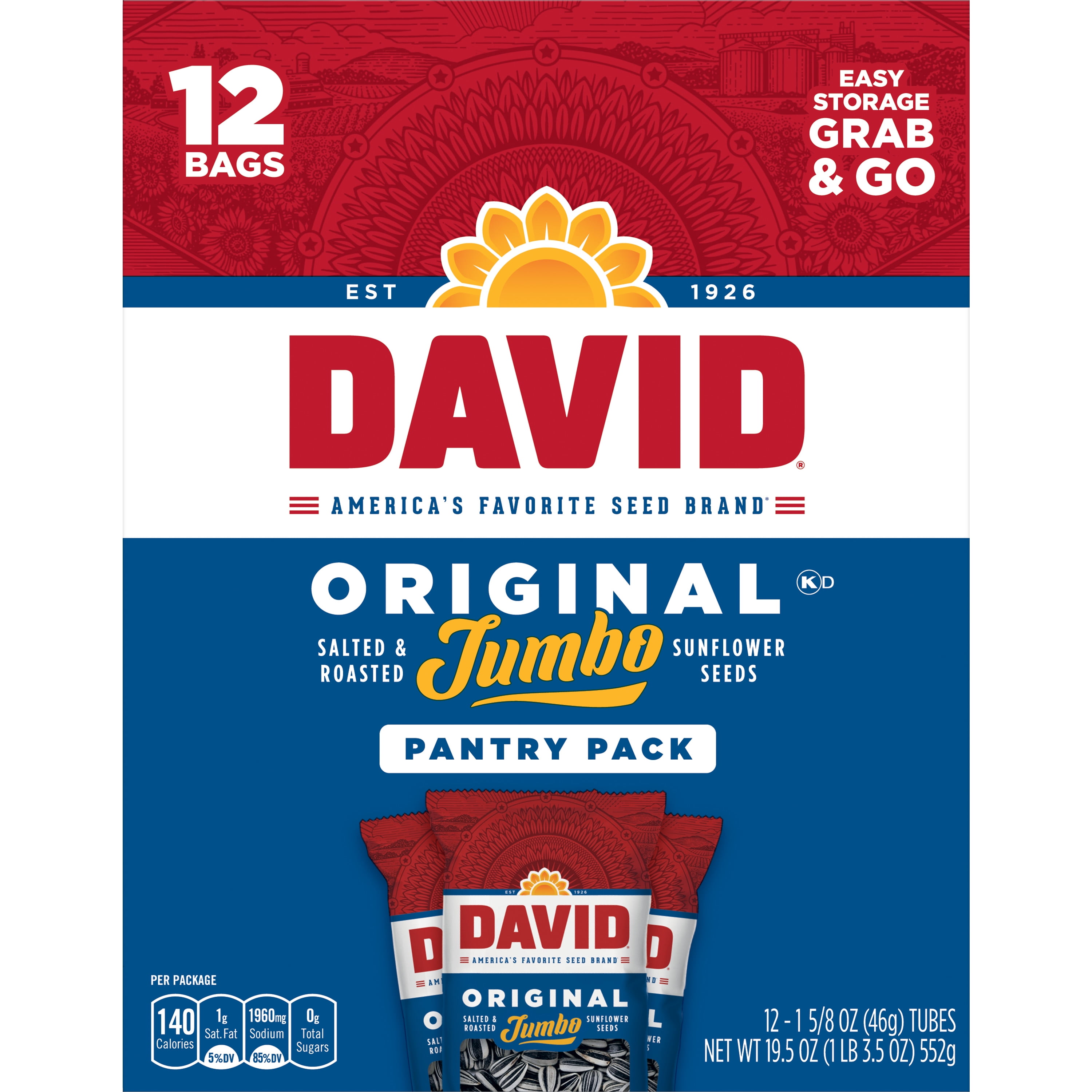 - Contains twelve 1.62-ounce bags of DAVID Jumbo Sunflower Seeds