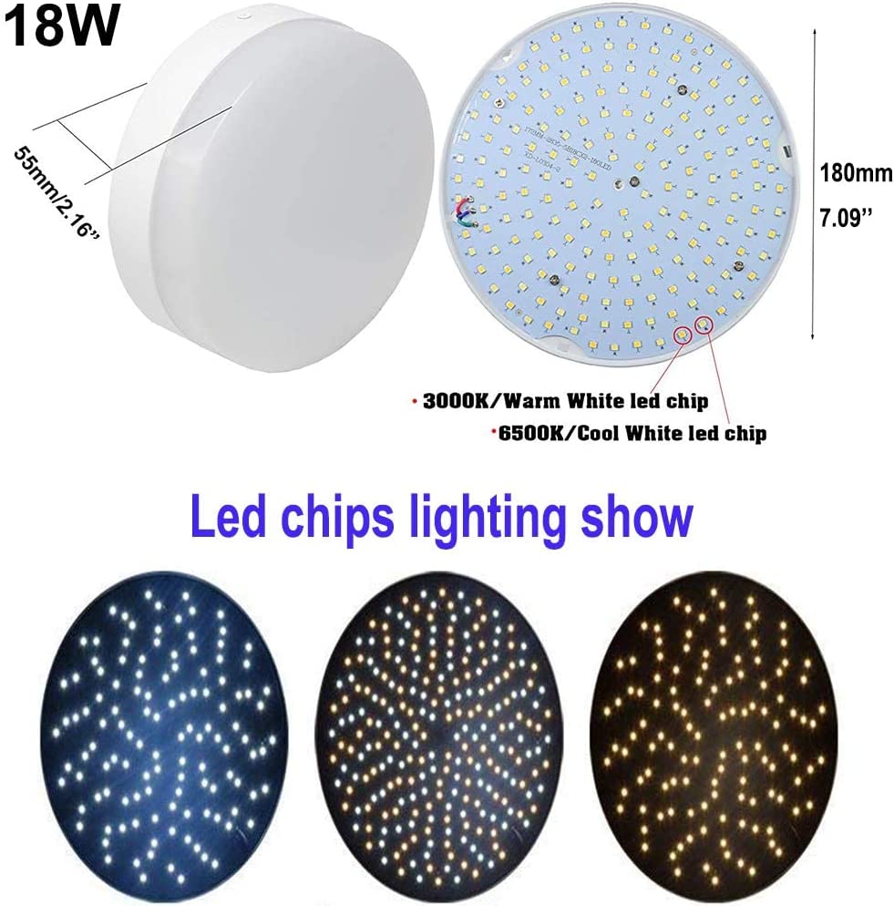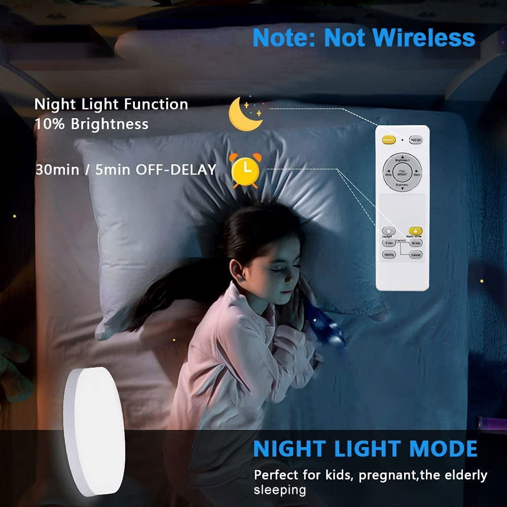 - 【Dimmable & 3 Color Changeable】: Remote control takes dimmable brightness adjustable and 3 colors temperature to meet your mood (3000K warm white, 4500K neutral white, 6000K cold white).In addition, our led ceiling light has a night light mode and timing design. You can choose between 5 minutes and 30 minutes off delay according to your needs. (Not wireless/Not battery operated/No motion sensor)