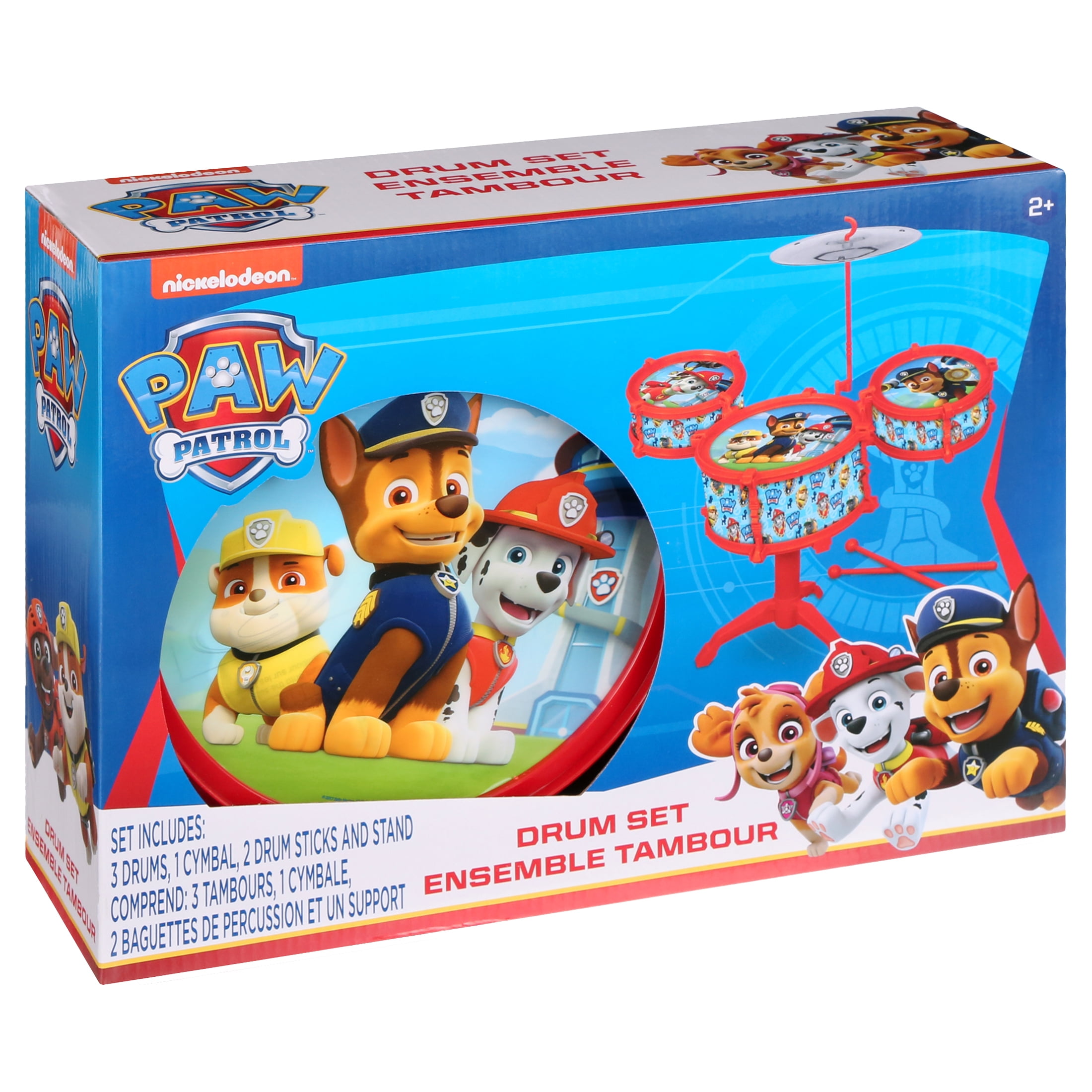 Paw Patrol set includes: 3 drums, 1 cymbal, 2 drum sticks and stand. For ages 2 and up.