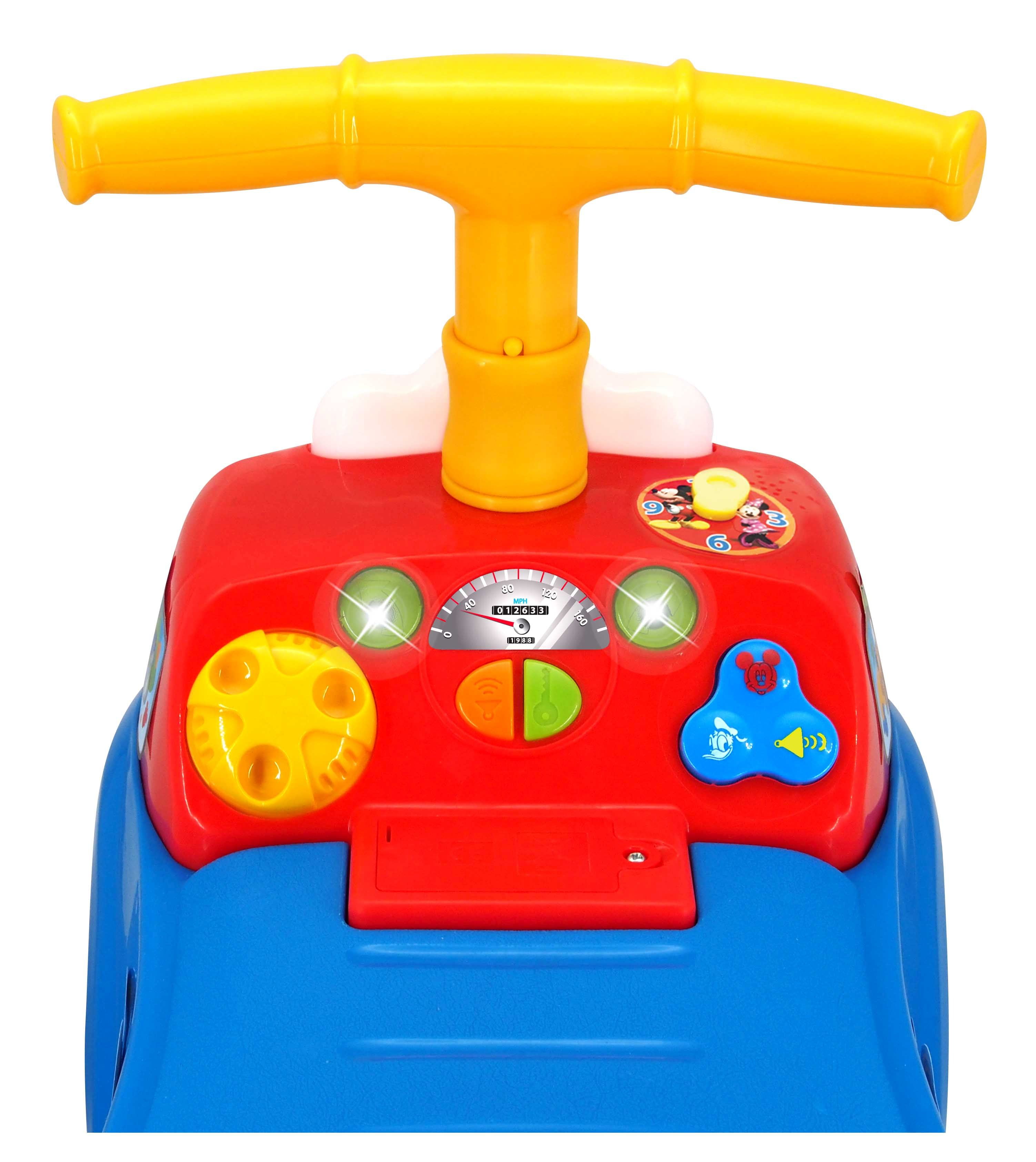 Disney Mickey Lights N’ Sounds Activity Ride-On: Ride along with Mickey to hear fun sounds and see flashing lights! Use the dashboard to control and enjoy the interactive electronic lights and magical sounds. Press for revving engine, or honk horn for a real driving experience. Handle bar folds down for ease of storage. Sturdy and durable construction for hours of safe riding fun. Requires 2 AA "try me" batteries (included).