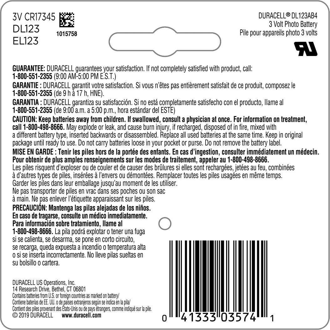- Duracell 3V High-Performance Lithium Battery 123, 4 Count, Long-Lasting pharmacists and medical professionals Contains high purity lithium for long-lasting energy Recommended for photo flashes, video equipment, security devices, and in toys & electronics Double pack of DL123 batteries, equivalent to 3V CR17345, and EL123 Crafted with ultra-high purity lithium and infused with triple corrosion protection Contain extra advanced Power Preserve technology