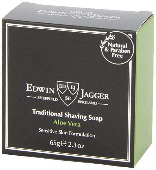 Edwin Jagger 99.9% Natural Shaving Soap in Tub, Aloe Vera – Edwin Jagger Natural Shaving Soaps are a great way to bring some tradition back into yourEdwin Jagger Natural Shaving Soaps are a great way to bring some tradition back into your daily grooming routine. They create a foamier, richer lather for your shave than a regular cream. And Edwin Jagger makes soaps that are friendly to both your skin and to the environment. Made with all natural and organic ingredients–including extracts from the Aloe Vera plant–this product is perfect for sensitive skin that is prone to rashes and irritation. The gentle ingredients are naturally paraben and additive free and will soothe your face as you shave. This soap is concentrated, so a little will go a long way. This tub will last you awhile. Once you run out, be sure to purchase a refill at a discounted price so you can continue to use your handy tub. Use this soap with a shaving brush and warm water to create a perfect lather every time. The aloe vera scent is light and fresh and is designed to linger subtly for hours.