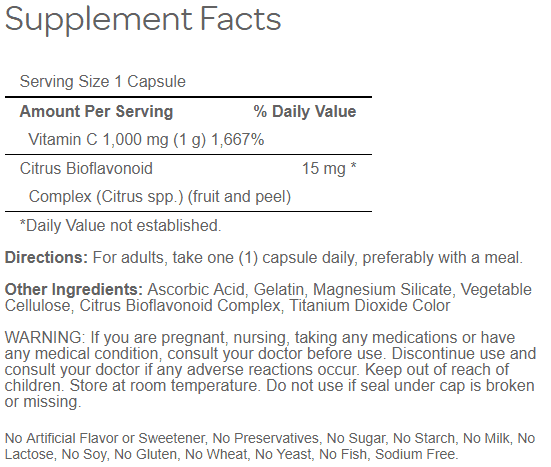 The better Vitamin C.Dietary SupplementNat/BountyActive Ingredients:1 Tablet: Vitamin C (as Ester-C Calcium Ascorbate) 500 mg; Calcium (as Ester-C Calcium Ascorbate) 55 mg; C-Sorb Citrus Bioflavonoids Complex 200 mg (Citrus Bioflavonoids [Citrus Sinensis] [Fruit], Sweet Orange, Tangerine, Lime, Lemon, Acerola, Rutin, Hesperidin Complex [Citrus Spp.] [Fruit], Naturally Occurring Vitamin C Metabolites); Vegetable Cellulose; Calcium Silicate; Vegetable Stearic Acid; Vegetable Magnesium StearateFor adults, take one (1) tablet two times daily, preferably with a meal. Store in a cool, dry place.Uses:Ester-C is a patented ingredient that provides powerful immune system support.* It is quickly absorbed and gentle on your stomach.* Ester-C also contains C-Sorb. Ester-C along with C-Sorb and naturally occurring metabolites, works synergistically to enhance the absorption and retention of vitamin C in your body. In a clinical study, white blood cell levels of Vitamin C were elevated in subjects receiving Ester-C when measured 24 hours after initial dose. Ester-C gives you powerful immune system support at the cellular level for up to 24 hours – to help keep you healthy.* Ester-C is non-acidic. That means it’s stomach-friendly. Ester-C is gentle on your stomach so you can feel comfortable taking it every day. #1 pharmacist recommended brand.** Suitable for vegetarians. Free of: yeast, wheat, milk or milk derivatives, lactose, sugar, preservatives, soy, artificial color, artificial flavor, sodium (less than 5 mg per serving), gluten, grapefruit. *These statements have not been evaluated by the Food and Drug Administration. This product is not intended to diagnose, treat, cure or prevent any disease. **Based on the results of the Pharmacy Times Survey among pharmacists who recommend a vitamin C supplement, 2008.If you are pregnant, nursing or taking any medications, consult your doctor before use. Discontinue use and consult your doctor if any adverse reactions occur. Keep out of reach of children.