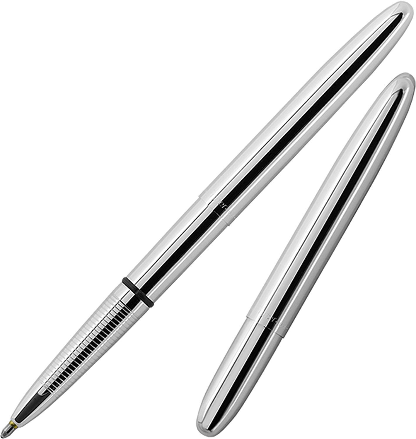 Chrome Bullet Space Pen. When closed, the Bullet Space Pen is the perfect size to carry in your wallet, pocket, purse, car glove box, organizer or toolbox. When open it’s a full sized, evenly balanced writing instrument. The original Bullet Space Pen was conceived in July of 1948. Paul Fisher was soon machining a pen design shaped from solid aluminum. It became our first Fisher ball point pen, the #400 Bullet Pen, and arguably the most popular pen of the twentieth century. This pen is now all brass with a Chrome finish.