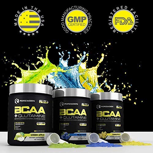 Forzagen BCAA + GLUTAMINE WITH HYDRAGEN -RebuildRecoverBoost ImmunityBCAA’s (Branched Chain Amino Acids) are an important group of essential amino acids, consisting of Leucine, Isoleucine and Valine. BCAA’s are among the MOST essential of the nine essential amino acids, for human consumption.They account for 35% of the essential amino acids in our muscle proteins. Leucine, Isoleucine and Valine are the most indispensable of this amino acid group. BCAA’s can also be consumed as food supplements, especially suggested around intense training or hard physical labor. They have also been seen to help retain lean muscle mass during times of recovery or inactivity.Excellent Refreshing Taste – NO bitterness, Easy mix , our Amino Acids Supplements is reaches the fastest recovery of the muscle, which is beneficial for any athlete or sports activity.