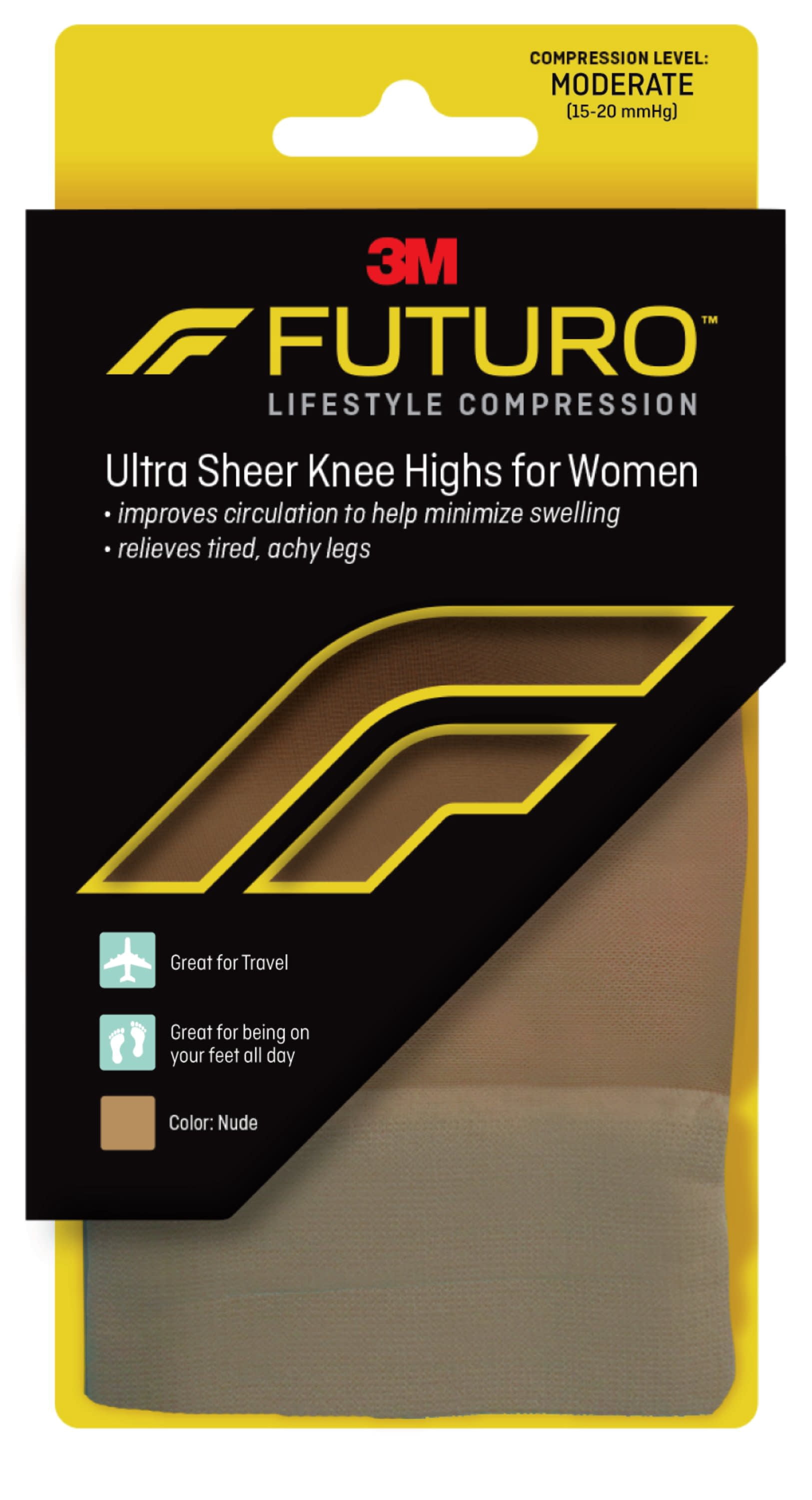 Step lively with style and energizing support in FUTURO Ultra Sheer Knee Highs for Women. Stay moving, working, traveling or playing with these ultra sheer compression hose that help keep your legs supported and comfortable from sun up to well after sun down. A tough run guard and heel and toe reinforcement provide the durability to meet the demands of your day. Ideal for everyday use, FUTURO Ultra Sheer Knee Highs for Women help improve circulation for lasting relief whether you’re sitting in the same spot for an extended period of time or on your feet all day long.