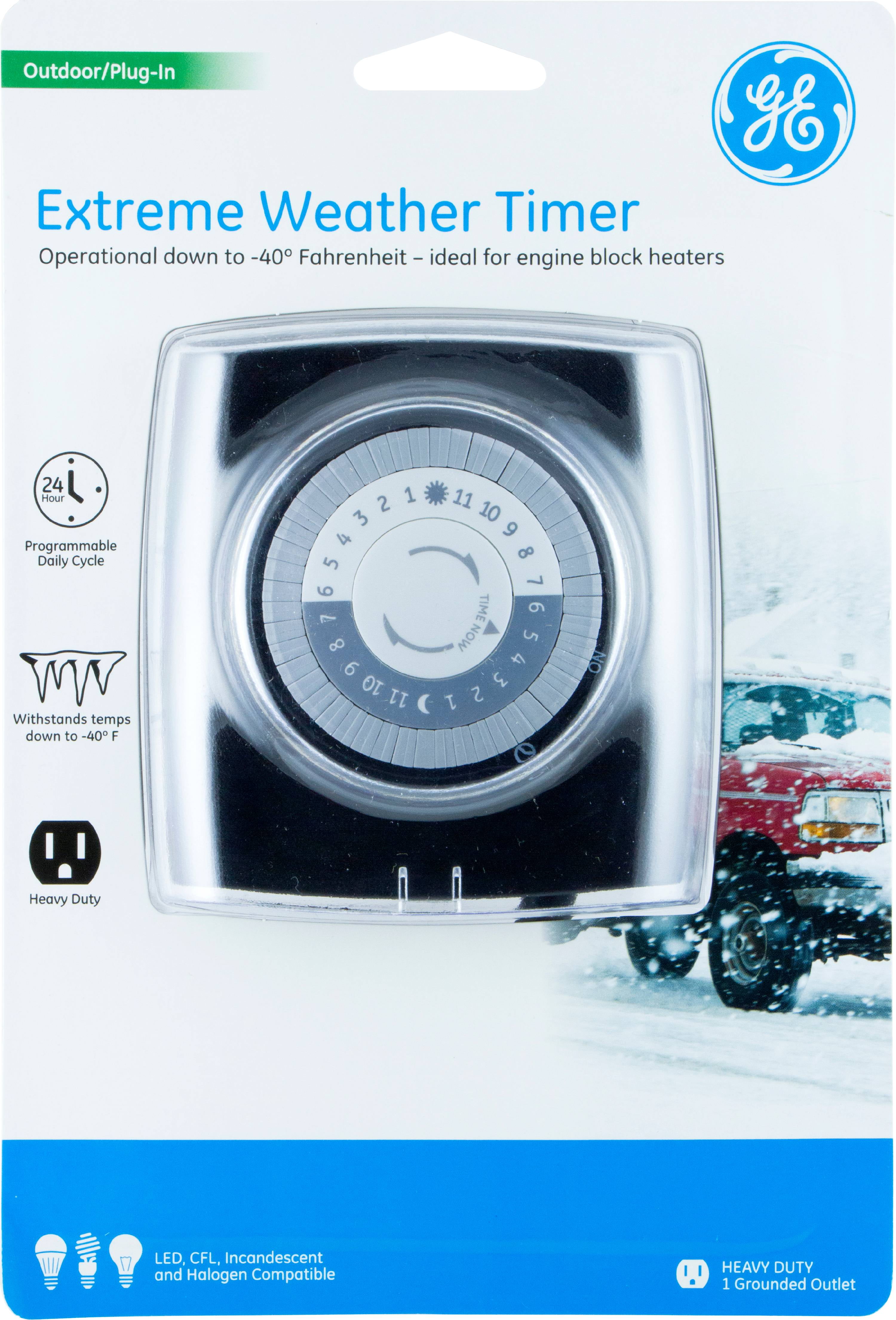 Prepare for the elements with the GE-branded Extreme-Weather Mechanical Timer. The rugged timer withstands temperature to -40 degrees Fahrenheit, which is perfect for engine-block heaters, landscape lights, seasonal décor and more. A clear, durable cover protects the easy-to-use timer and prevents settings from accidentally being changed.