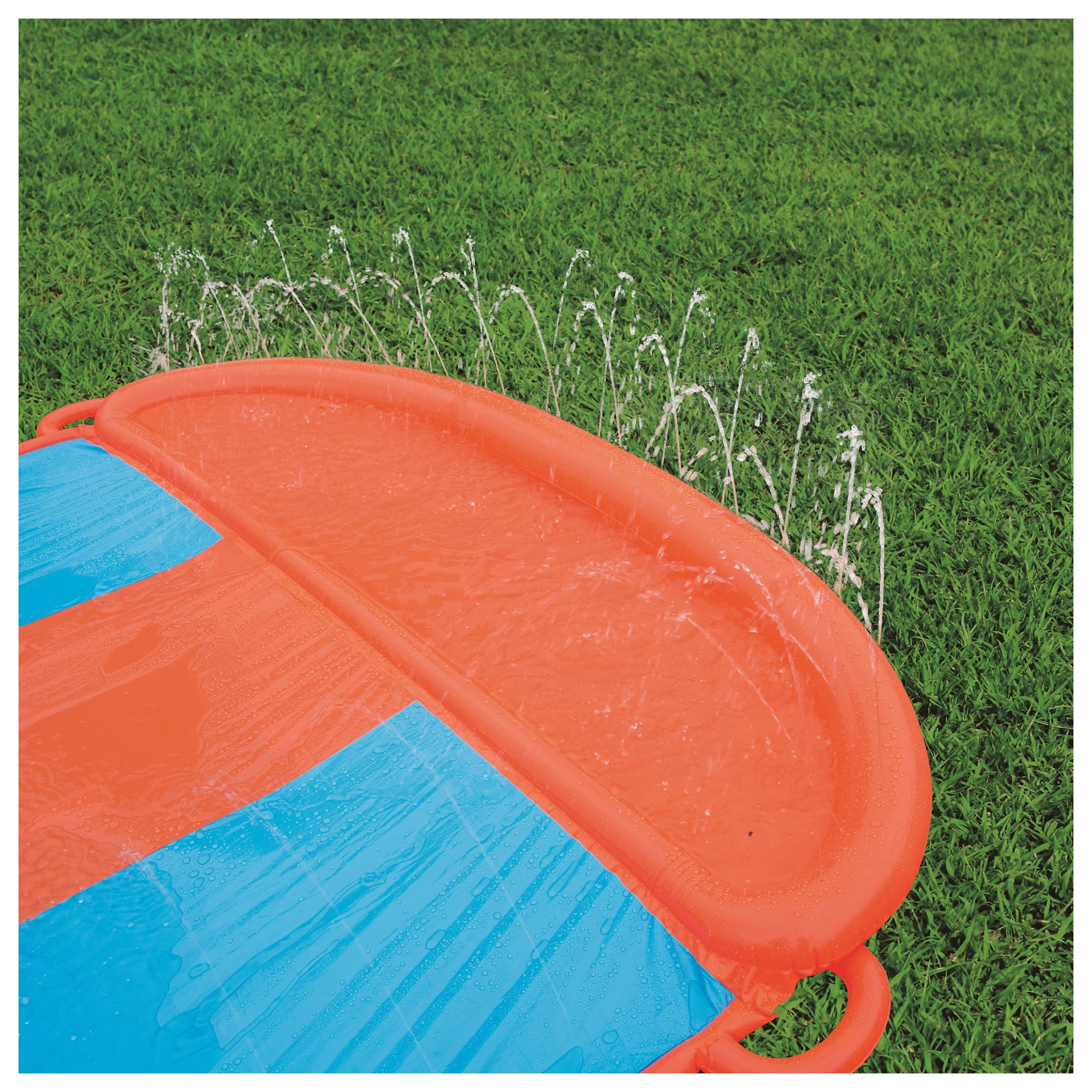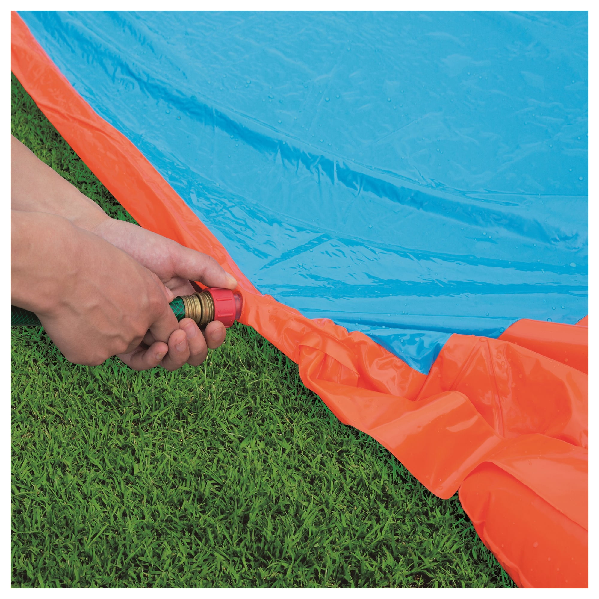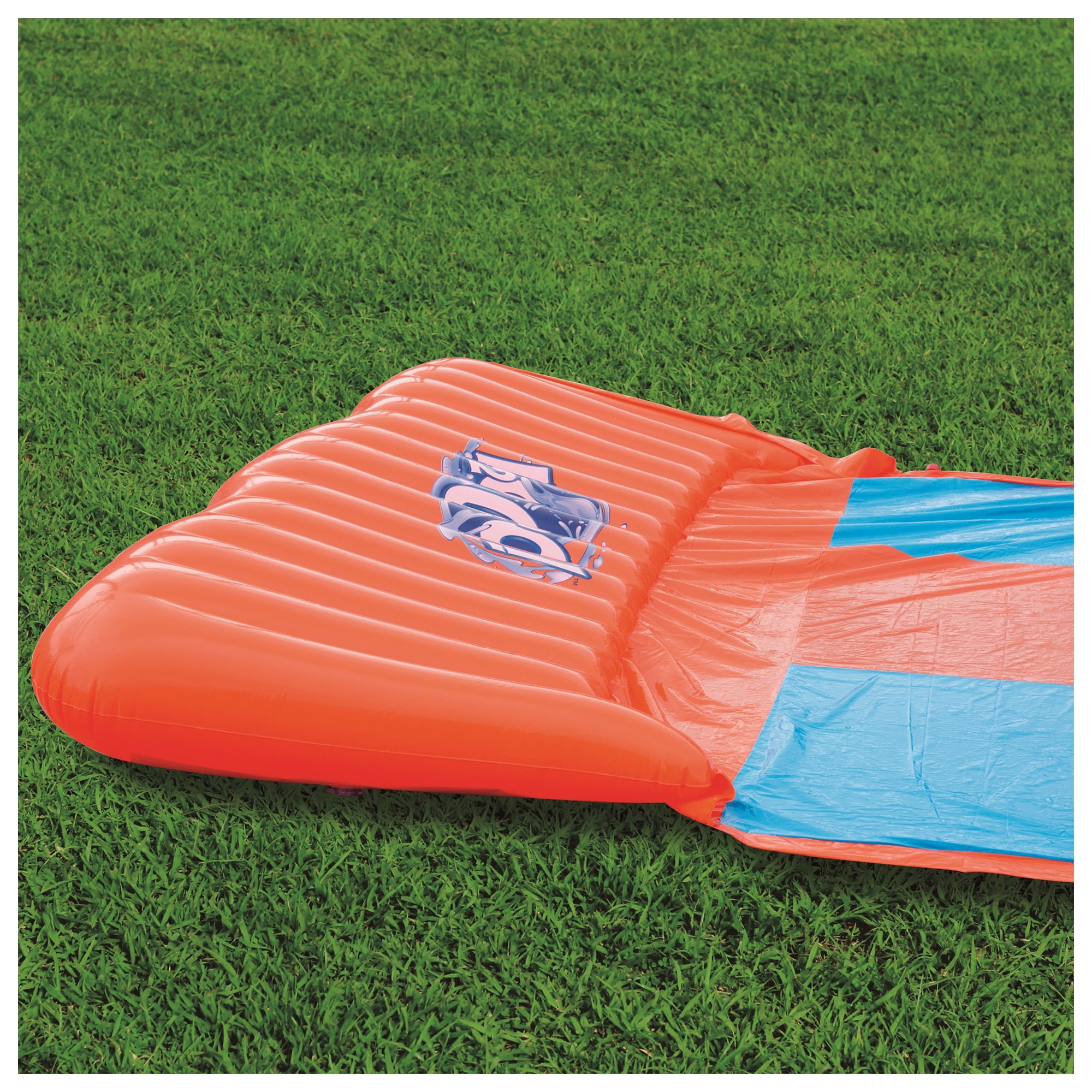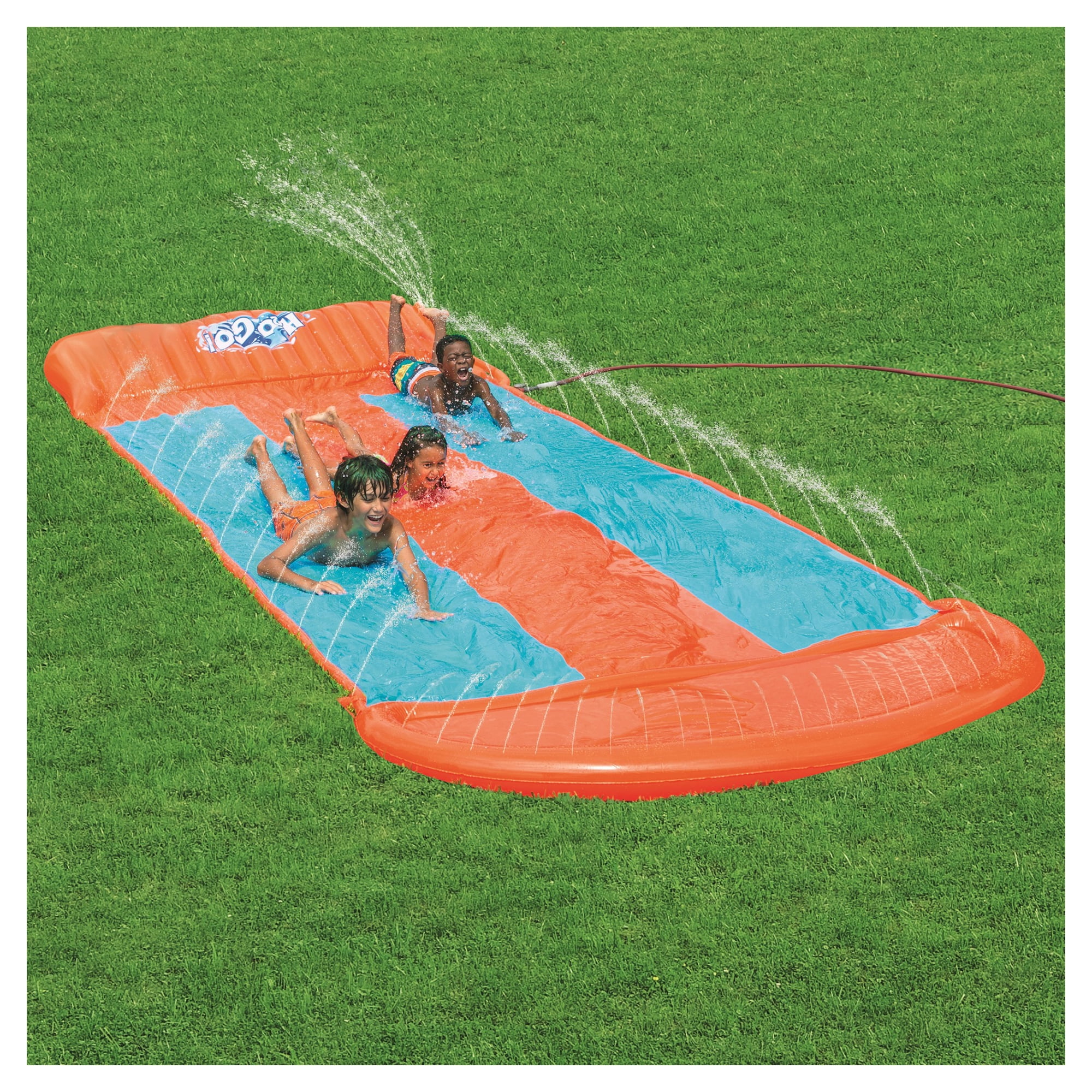The H2OGO!™ Triple Ramp Slide is perfect for family gatherings, birthday parties or any event with eager slip n’ sliders! The 18′ Water Slide has a air filled ramp at the beginning of the slide that launches kids into a super-fast ride that ends with a drench pool splash landing. Built-in water sprayers provide a water cascade effect, keeping the lanes slick. Pour the fun on your next party with the H2OGO!™ Triple Ramp Slide. Recommended for ages 3 and up. WARNING: CHOKING HAZARD — Small parts. Not for children under 3 yrs.• 18′ three-lane water slide with air-filled launch ramp • Built-in sprinklers for cascading effect • Custom-designed drench pool for splash landing • 100% powered by household water hose • Heavy-duty repair patch