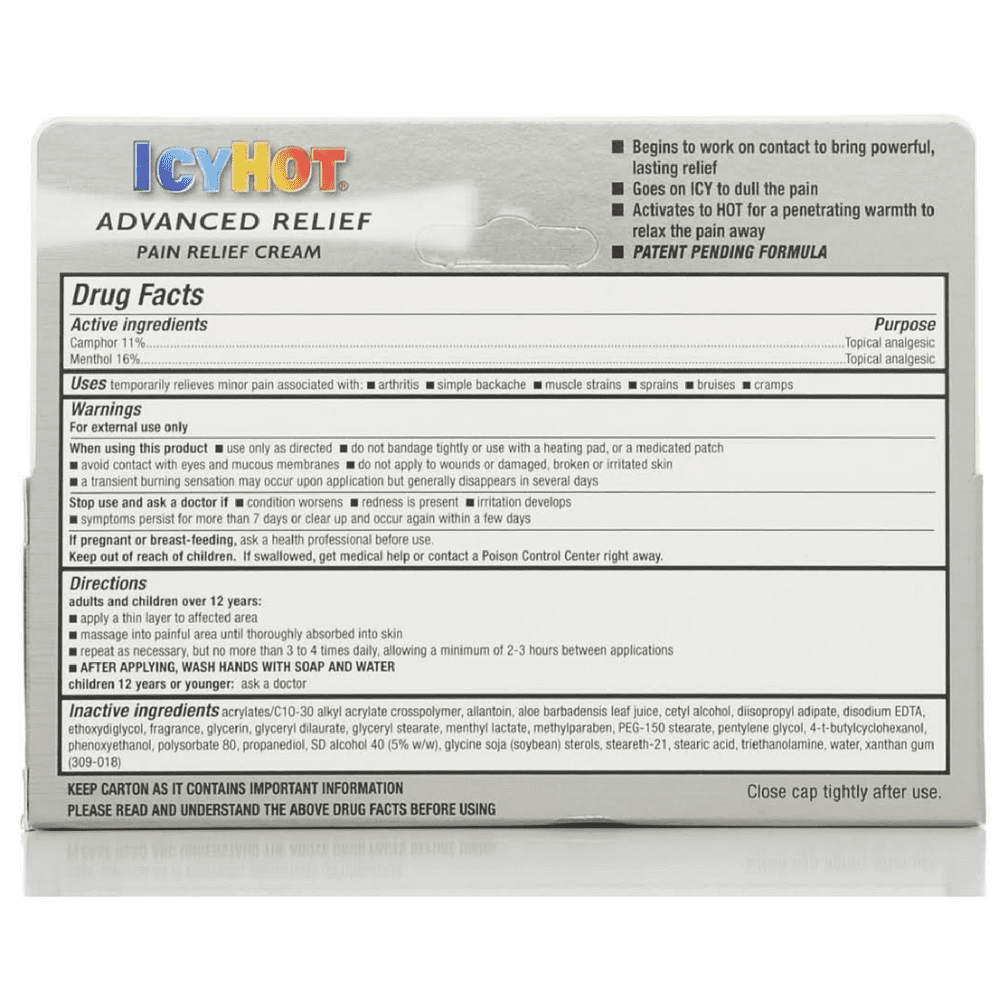 2 Max strength pain relievers – Advanced relief for tough pain. Active Ingredients: Menthol (10%), Methyl Salicylate (30%) Inactive Ingredients: Carbomer, Cetyl Esters, Emulsifying Wax, Oleth 3 Phosphate, Stearic Acid, Triethanolamine, WaterIcy To Dull The Pain. Hot To Relax It Away.® Time Release Formula