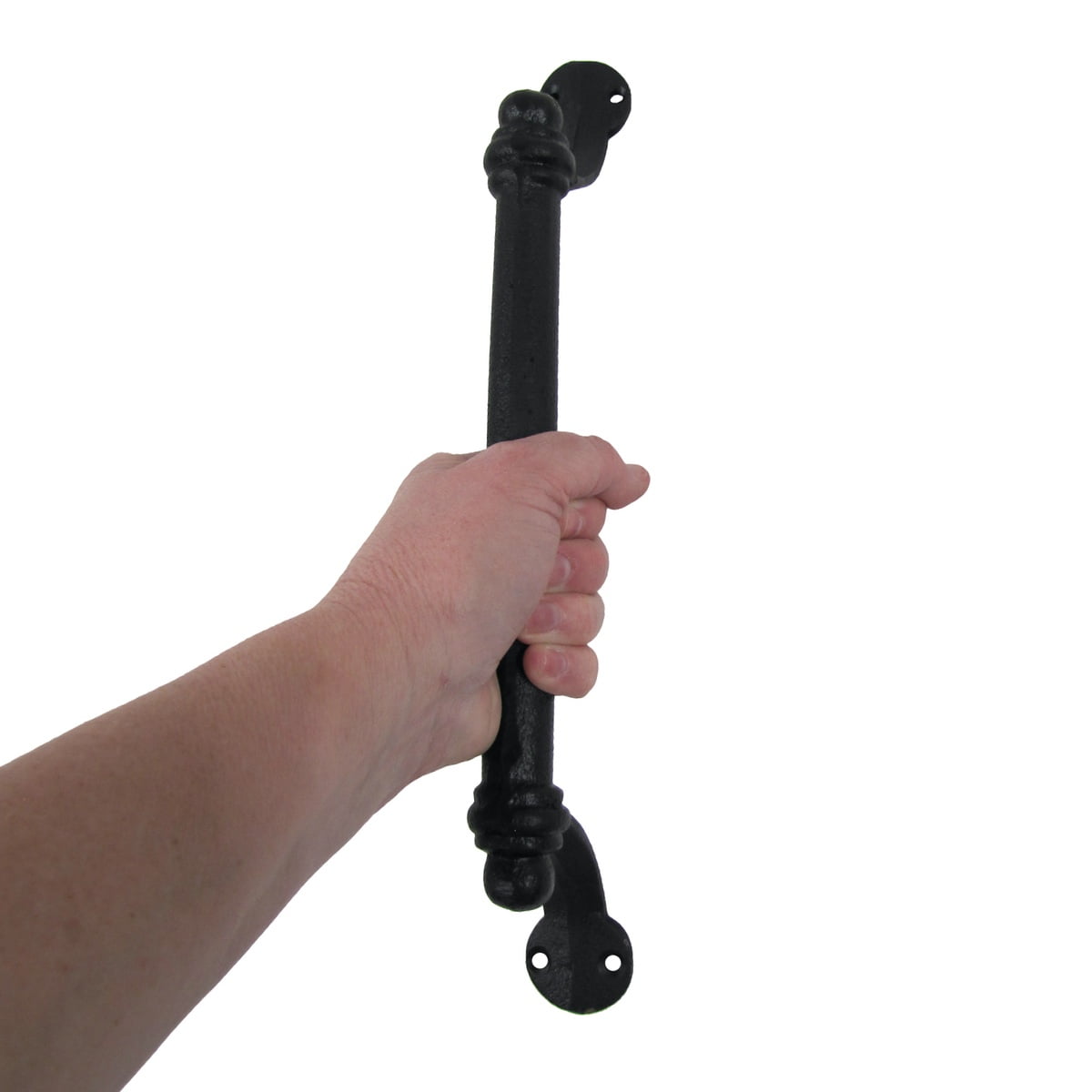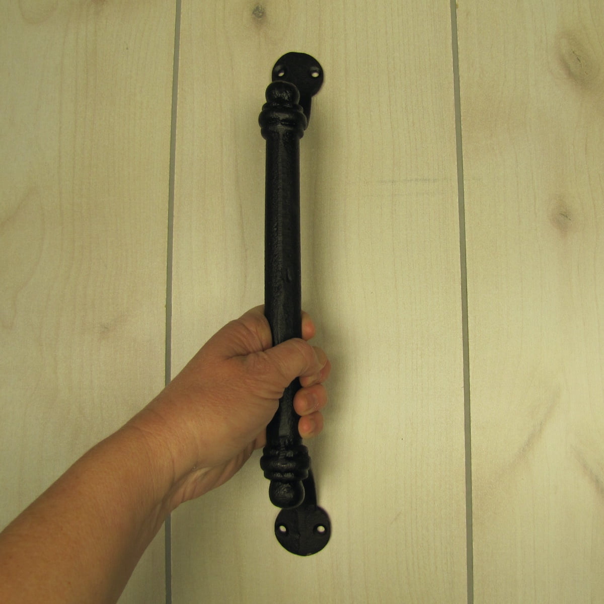 Add elegant vintage decor to your home with this large, rustic cast iron handle. Finished with a dark, earth-worn color to resemble a weathered antique door pull, this cylindrical shed hardware adds a classic touch to your gate or barn door. Each end of this huge handle is raised and curved, giving it antique appeal. Use this large metal handle inside your home to rejuvenate your sliding, patio, and barn doors. Get several of these rust-colored handles and give them as a housewarming gift to friends, family, or new neighbors. Vintage-style door pull measures approximately 13 5/8" long and 1 1/2" wide with 2 1/4" of space between the surface and handle and features four pre-drilled mounting holes. As with all our products, this rustic slide door hardware ships brand new in manufacturer’s packaging with our 100% customer satisfaction guarantee.