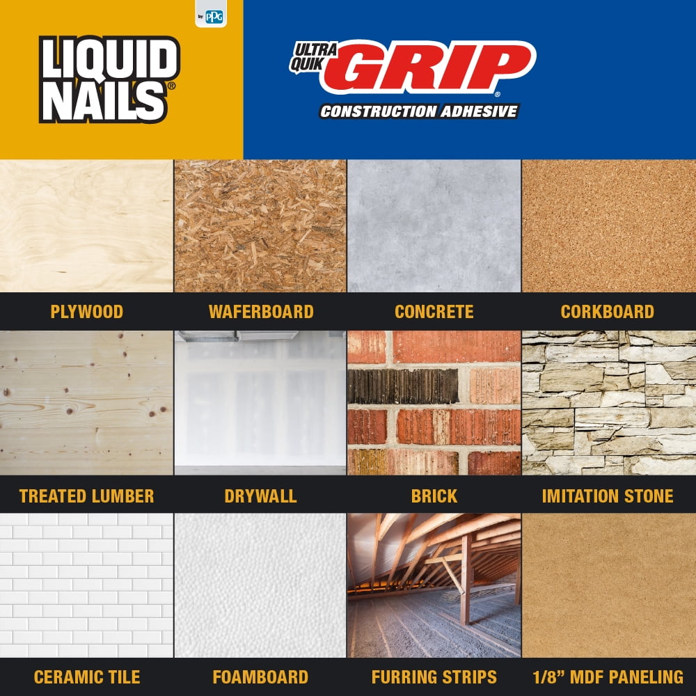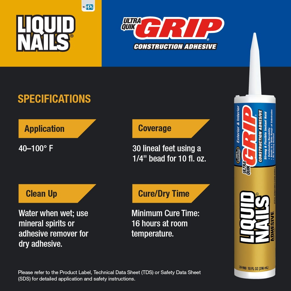 Liquid Nails Adhesive LN-990 Ultra Quick Grip is a premium, high strength, fast-bonding adhesive offers a quick initial grab for interior and exterior projects with no bracing required and a minimal need for mechanical fasteners. This formula offers flexibility in low temperatures, creating a bond that resists breaking in cold temperatures. It’s perfect for installing crown molding and other jobs that require a fast hold and an elegant look.