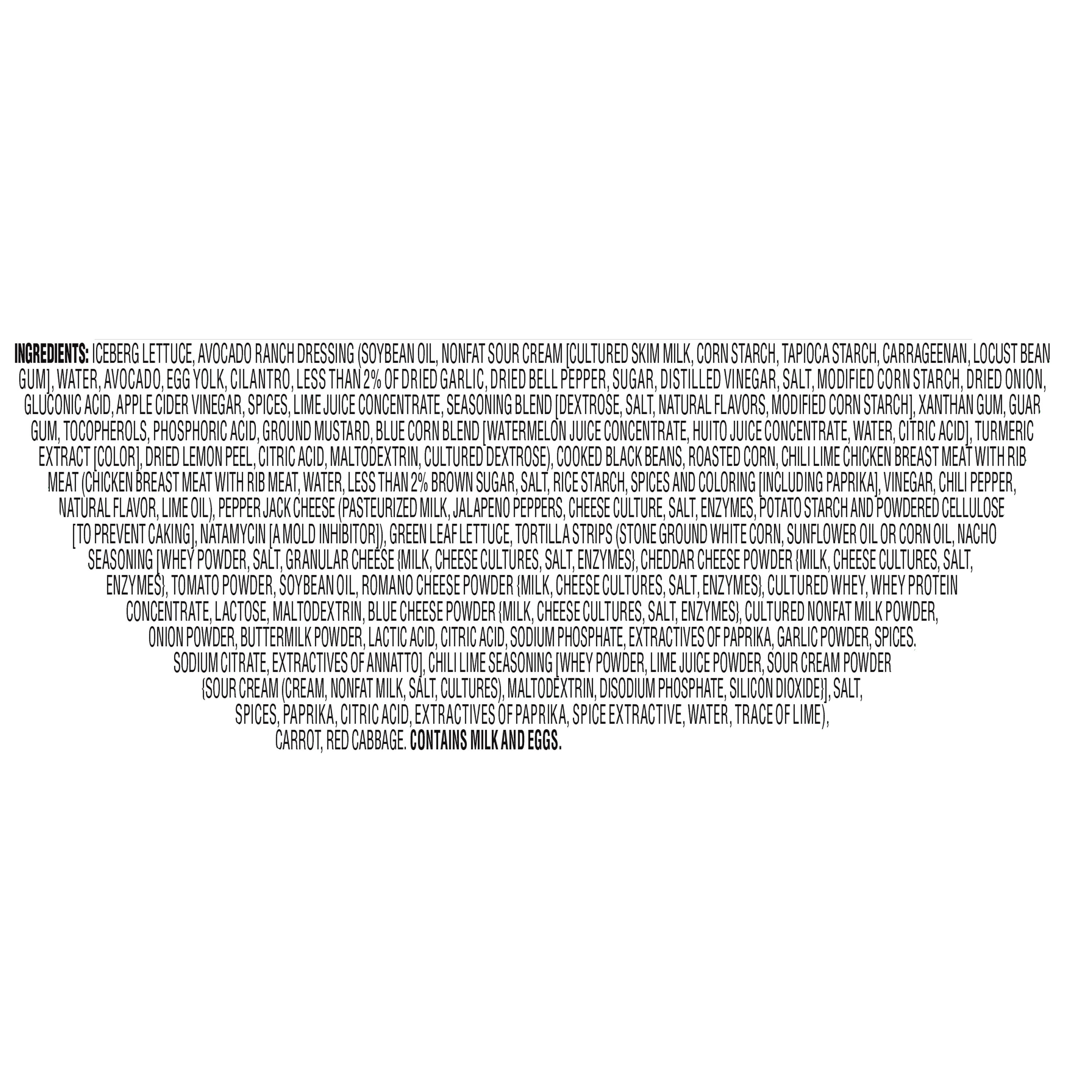 - Refreshing mix of iceberg and green leaf blend lettuce, cooked black beans, corn, chili lime seasoned white chicken meat, pepper jack cheese, tortilla chips and a creamy avocado ranch dressing