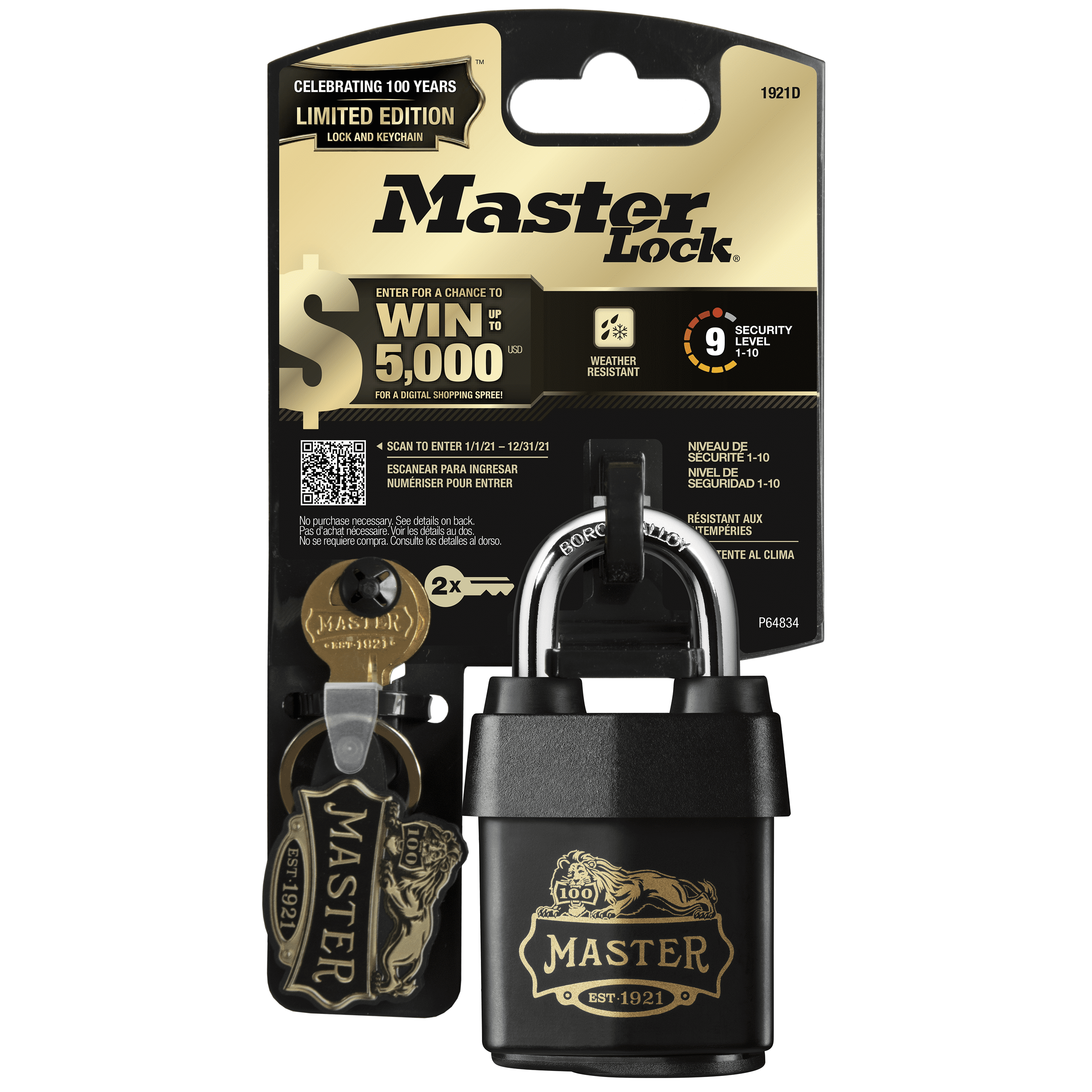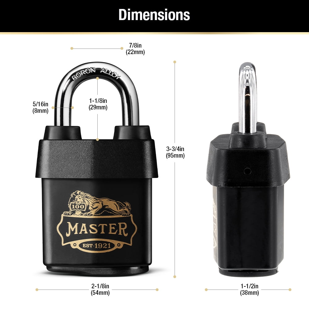 Celebrate 100 years of security with the Master Lock 1921D Heavy Duty Outdoor Padlock with Key. This limited edition padlock features the original Master Lock logo, limited edition keys, & a special key chain. A 2-1/8in (54mm) wide reinforced laminated steel body for maximum strength and reliability. The 5/16in (8mm) diameter shackle is 1-1/8in (29mm) long and made of hardened boron alloy, offering maximum resistance to cutting and sawing. A weatherproof lock body and keyway cover is designed to add protection against moisture, dirt and grime. The 4-pin cylinder prevents picking and the dual ball bearing locking provide maximum resistance against prying and hammering. The Limited Lifetime Warranty provides peace of mind from a brand you know and can trust.