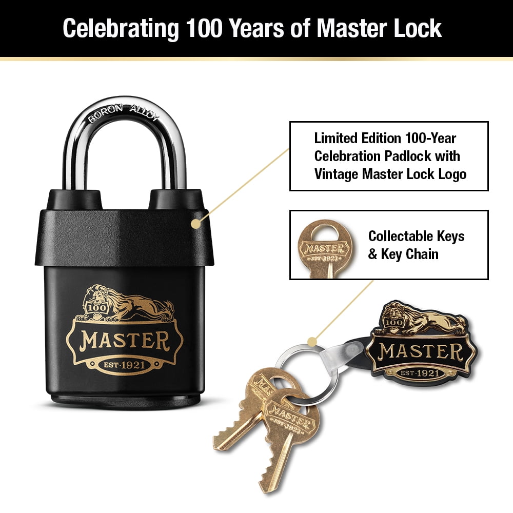 - One limited-edition 100-year celebration padlock, two keys; Also includes one Master Lock 100-year celebration key chain