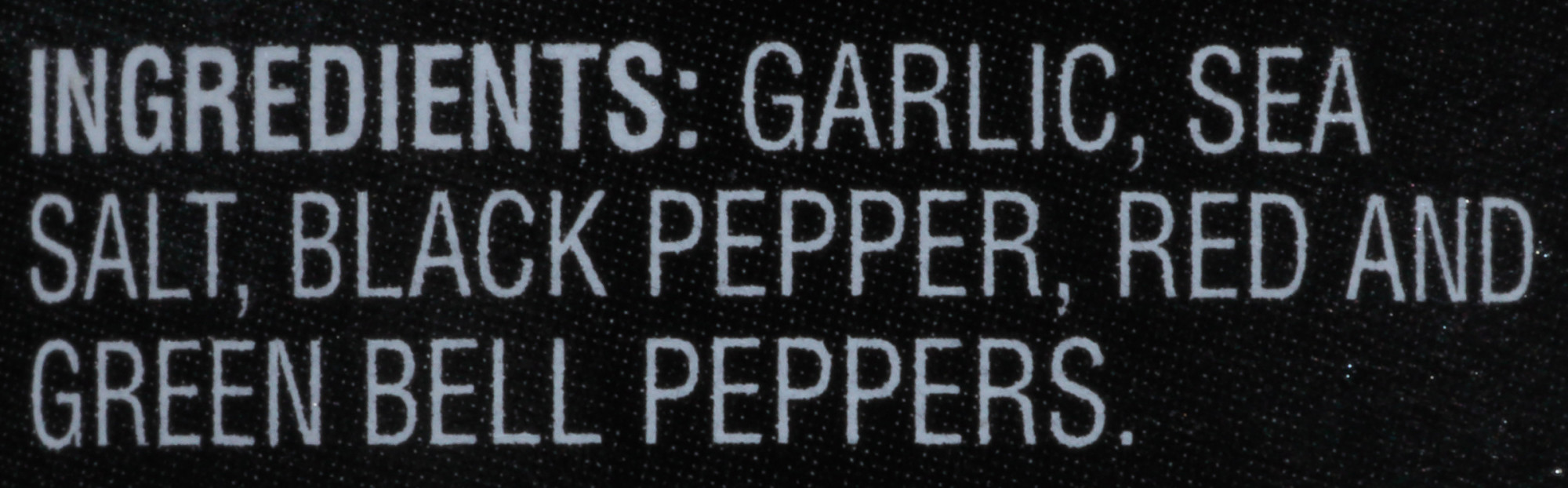 - Seasoning blend of garlic, black pepper, sea salt and green and red bell peppers