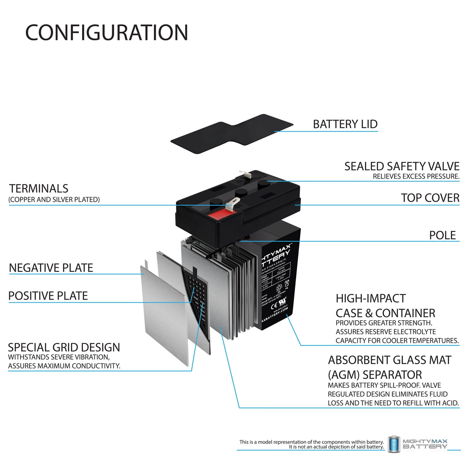 Delivering power when you need it, the Mighty Max ML4-6 6 Volt 4.5 AH uses a state of the art, heavy-duty, calcium-alloy grid that provides exceptional performance and service life in both float and cyclic applications.