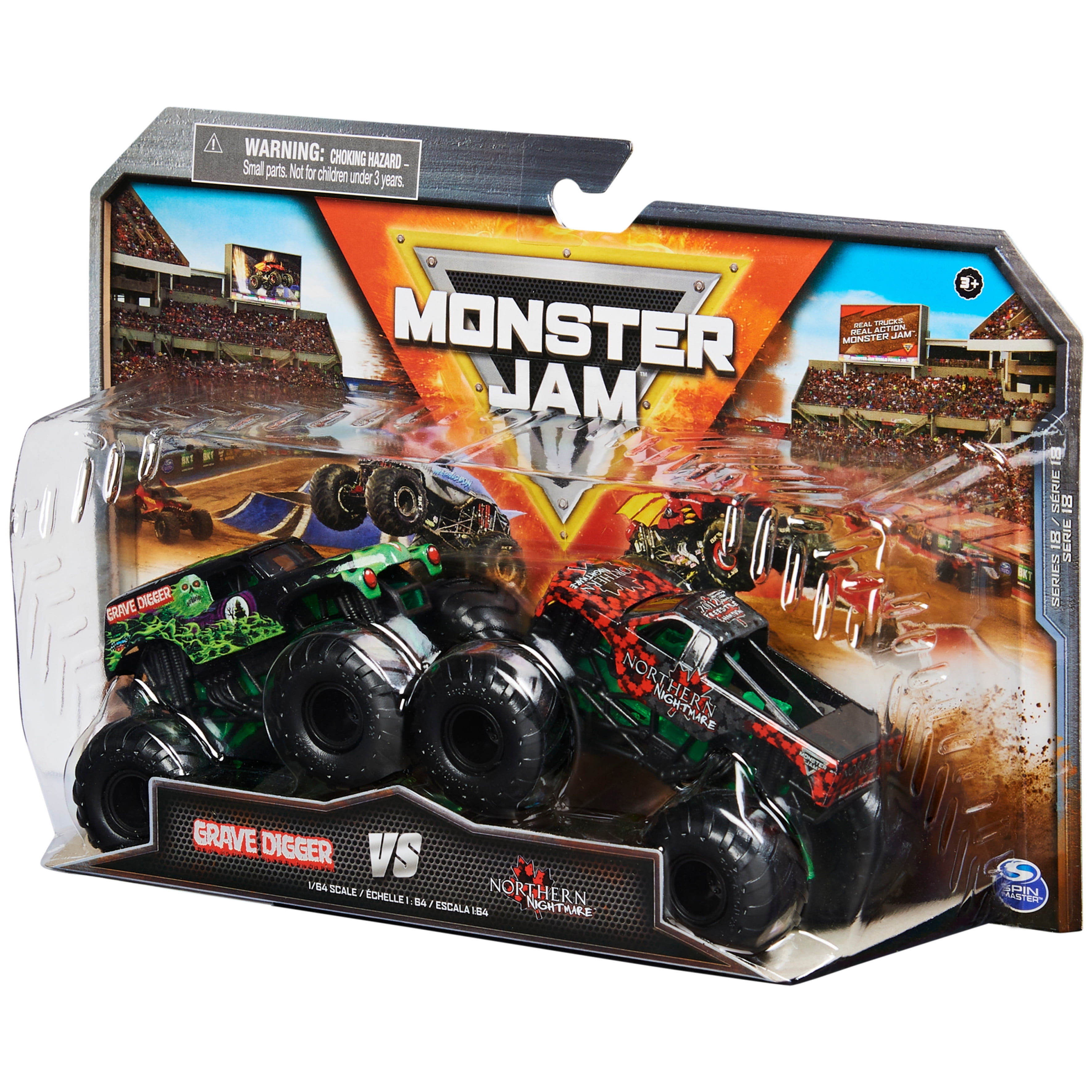 - HEAD-TO-HEAD ACTION: Put on an awesome Monster Jam show with the 2-Pack! Each set comes with 2 iconic Monster Jam monster trucks, including Grave Digger vs. Higher Education, Bulldozer vs. Racing Stripes and more!