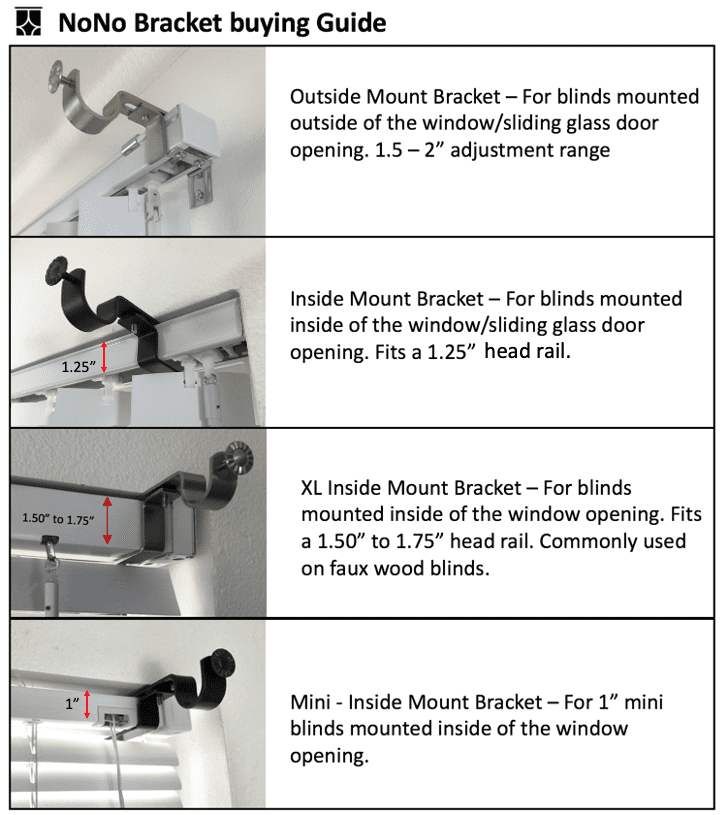 Changing the look of a room has never been easier! With the NoNo Bracket, you can easily and quickly hang curtains without any drilling, hammering, or screws in your walls. The NoNo Bracket attaches to your existing blind headrail in minutes! Choose the style that corresponds with how your blinds are installed. Typically, blinds are installed outside or inside of the window frame. If your blinds are mounted outside of the window frame, you require our Outside mount brackets. If your blinds are mounted inside the window frame, you require our Inside mounted brackets. Available in standard size, XL, and Mini for mini blinds. Compare your blinds with our product images to ensure you purchase the correct style for your windows. Be sure to remove the plastic blind headrail cover (if present) when measuring your head rail.