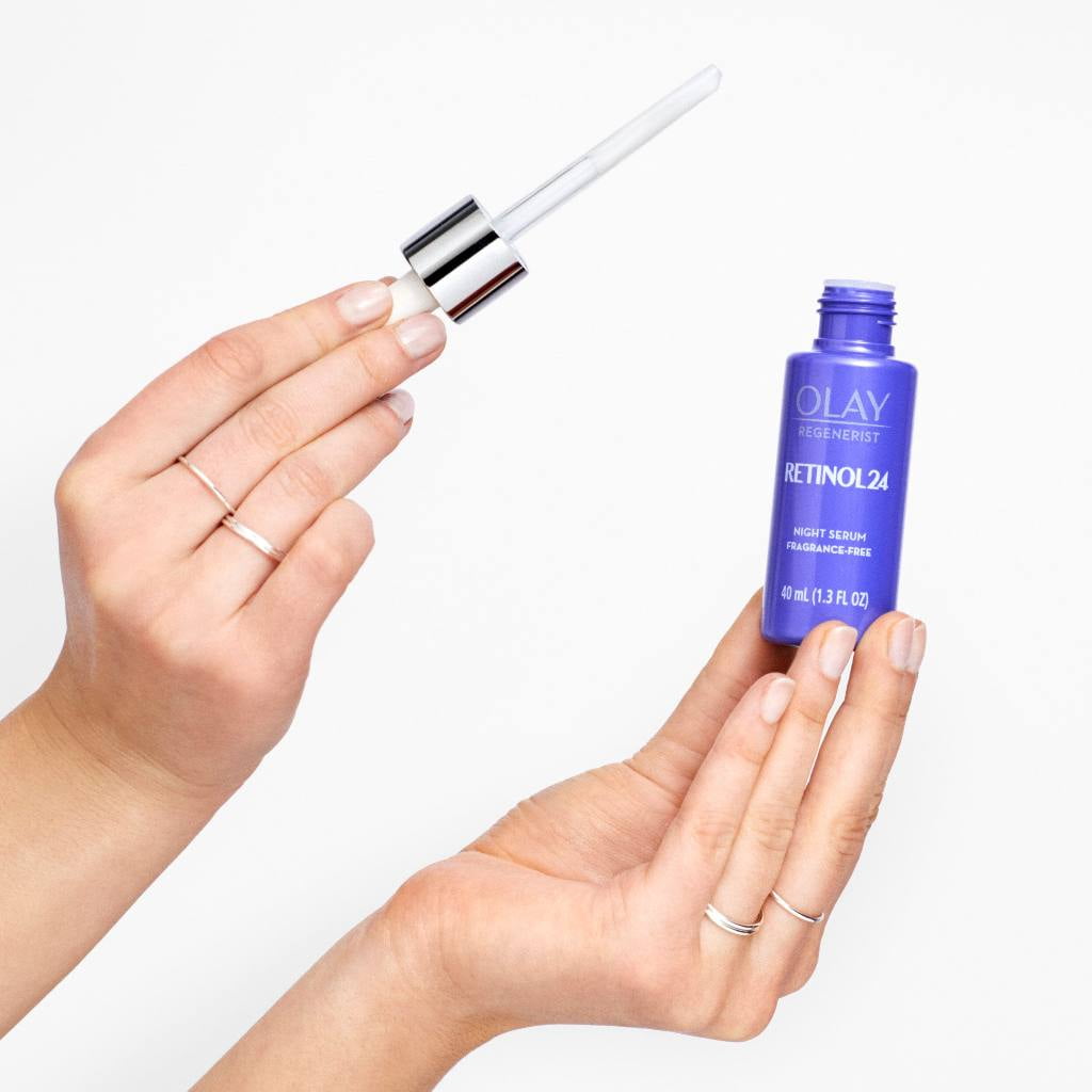 Olay Regenerist Retinol 24 Night Facial Serum penetrates deep into skin’s surface layers. Our proprietary blend of Vitamin B3 + Retinol complex hydrates skin for 24 hours for a bounty of benefits. You’ll see visible improvements in fine lines & wrinkles, smoothness, brightness, firming, dark spots, and pores. Retinol 24 Night Face Serum delivers all of these benefits with virtually no irritation. This fragrance and dye free formula absorbs quickly and goes deep into your skin’s surface so you wake up every morning to younger-looking, radiant skin. Use Olay daily for 28 days and see true skin transformation