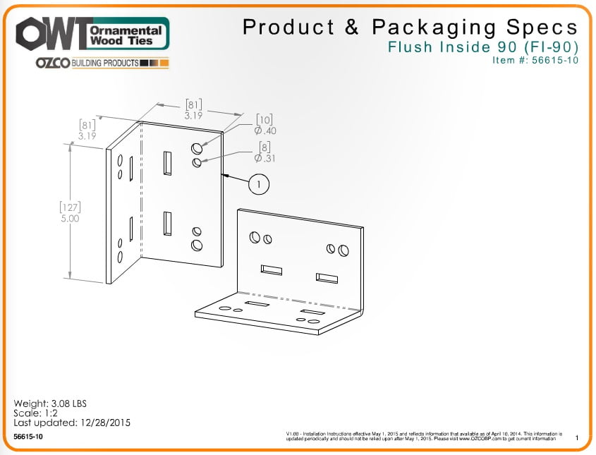 90 Flush Inside. Item #: 56615 (FI-90). OZCO Ornamental Wood Ties (OWT) Truss Ties are so versatile, they can be used on almost any project. No matter the angle, OWT has it covered with powder coated, hot dipped galvanized steel truss ties that will last for years to come. OWT saves you time as they do not require extra labor and material to conceal them, and can be used with all types of lumber from pressure treated to cedar and more, giving your project a timeless look. Kit Includes: (2) 90 Flush Inside Plates. Approved to Use With ACQ Treated Lumber Hot Dipped Galvanized Steel Powder Coated. Each Kit requires 2 Truss Accent Kits (sold separately) to achieve the Laredo Sunset decorative style.