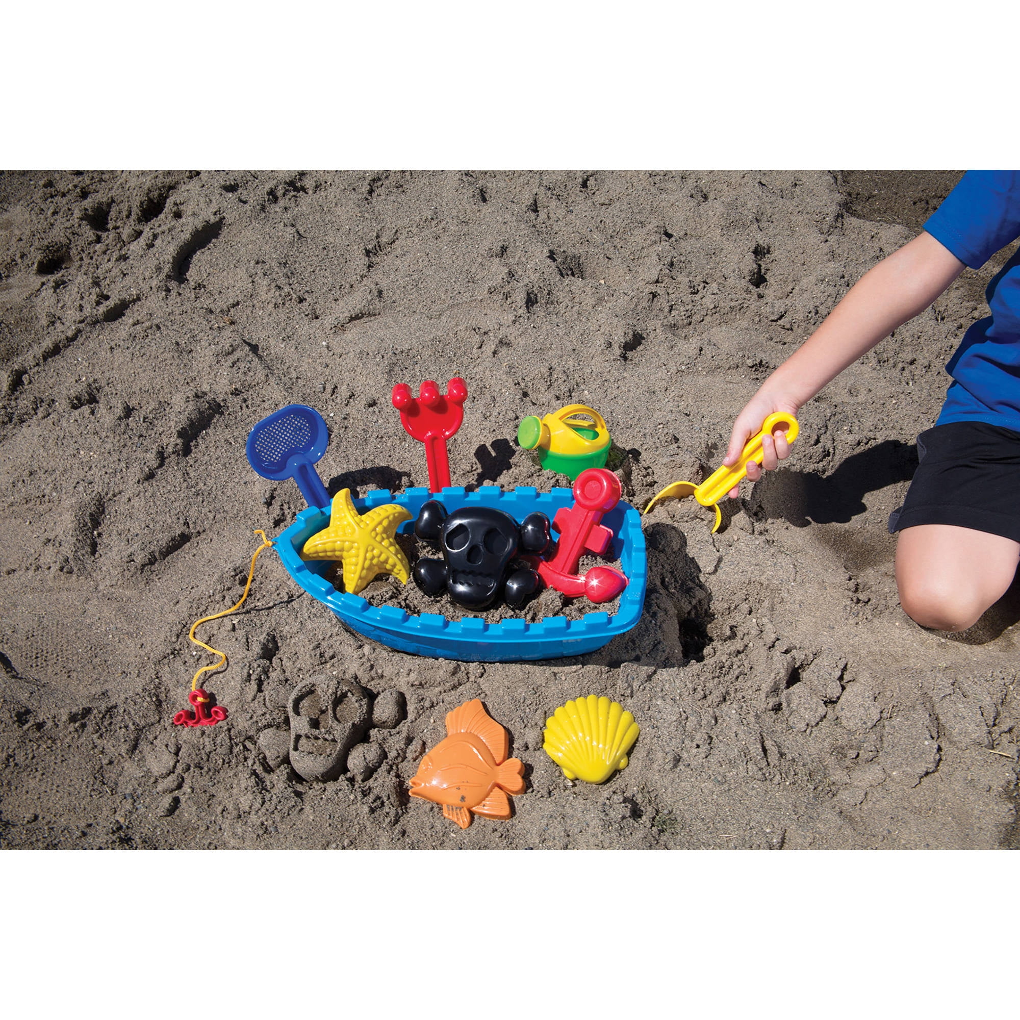 Ahoy! Your little pirate will love playing in the sand with this pirate ship beach toys set from Toysmith. This play set includes nine pieces: a 14" ship bucket, shovel, sand sifter, rake, watering can and four sand molds to build sand structures with. The sand molds are in the shapes of a skull and crossbones, anchor, shell and fish. The ship has wheels and an anchor for easy towing in the sand at the beach, lake or in the sandbox. These colorful pieces are made of sturdy molded plastic to hold up to the rigors of playtime. This set is suitable for children aged 18 months and up.