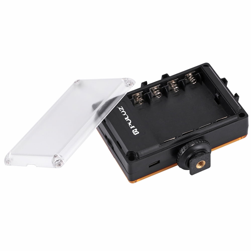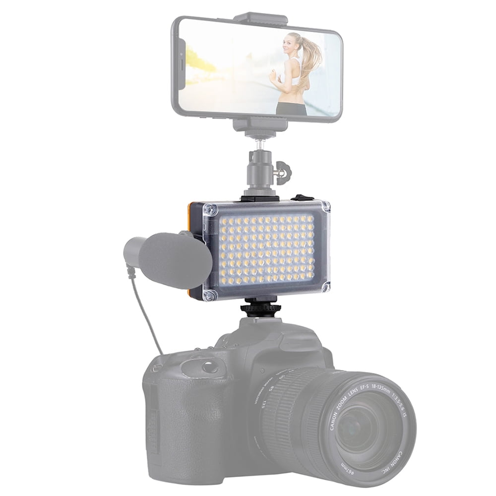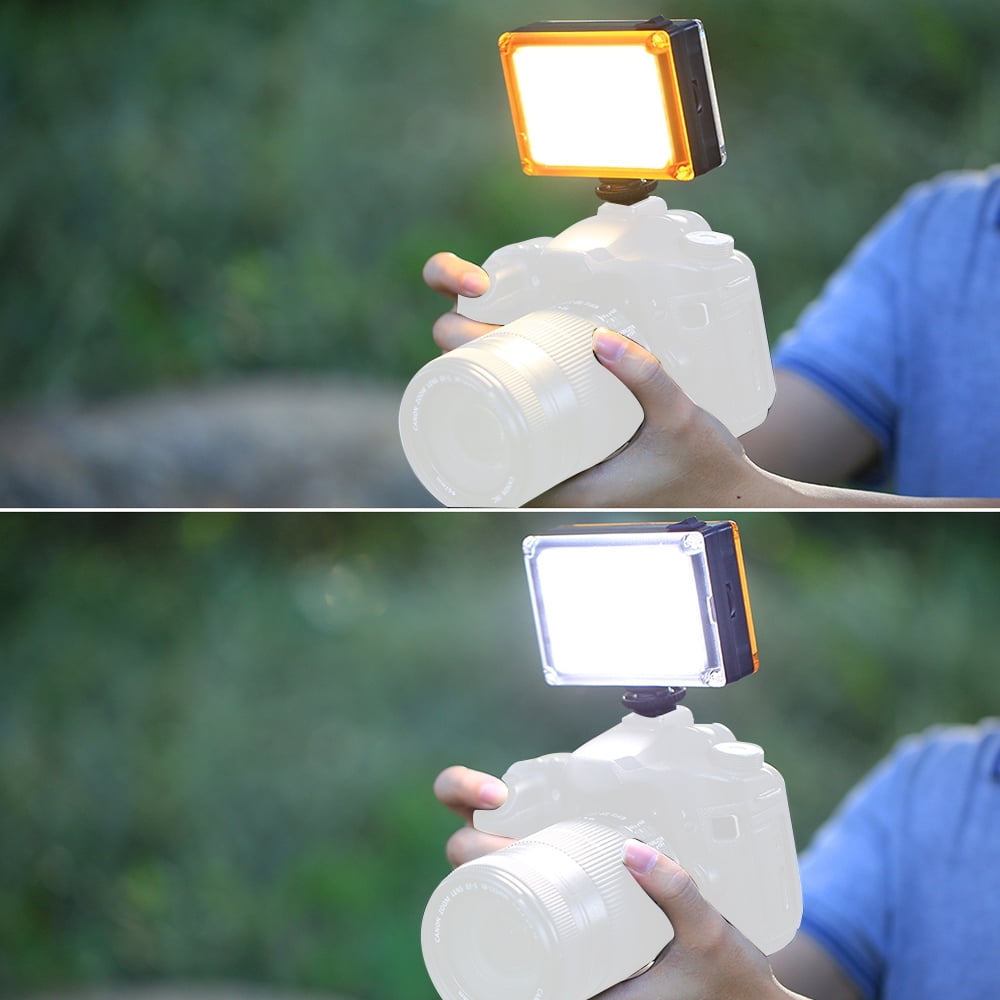 Built in 104 pieces great quality LED beads. Design an independent power switch and keep the same brightness out when switching it on again. Rotating the switch can adjust the brightness without filter plates, for various photography. Mini design, easy to take in the pocket, and lightweight. The magnetic semi-transparent cover is a useful filtered plate, clear or orange. Can be fixed in the camera hot shoe socket, professional light frame, or camera tripod use.