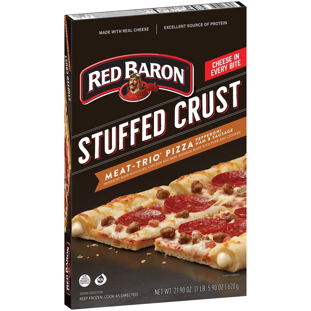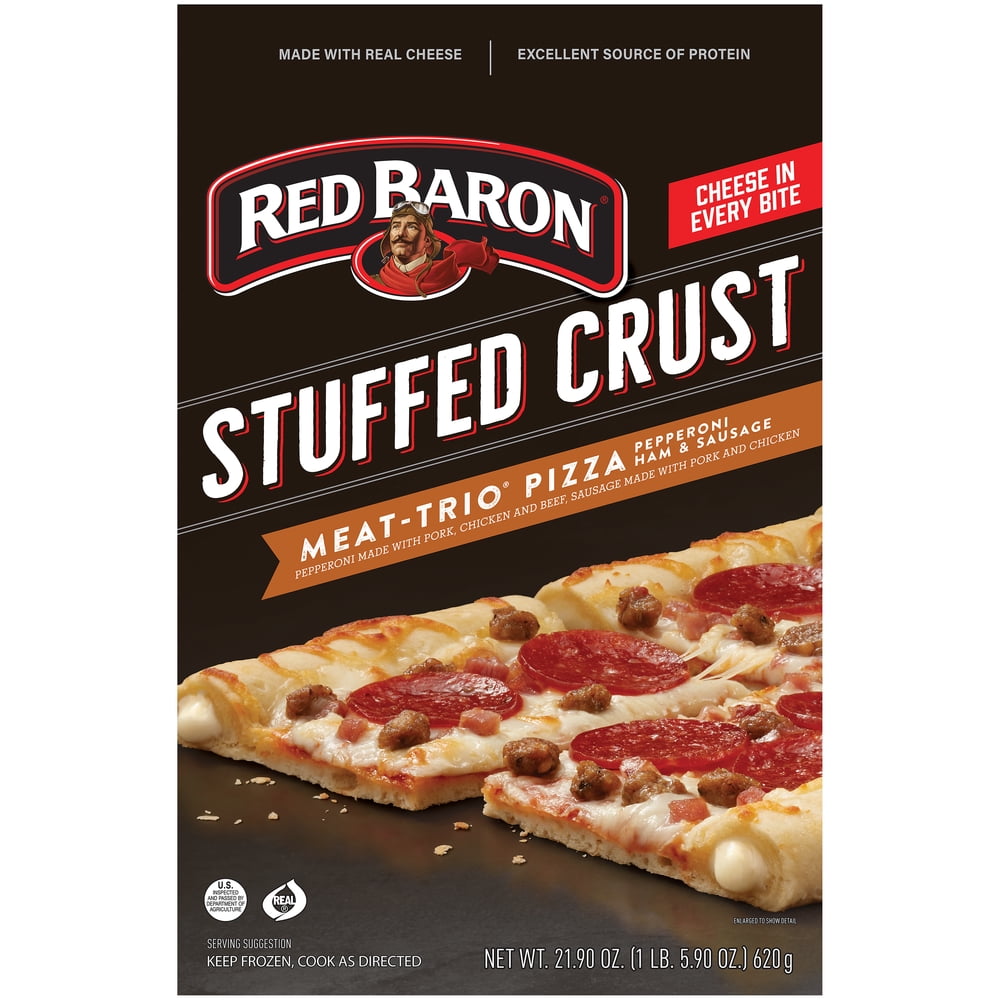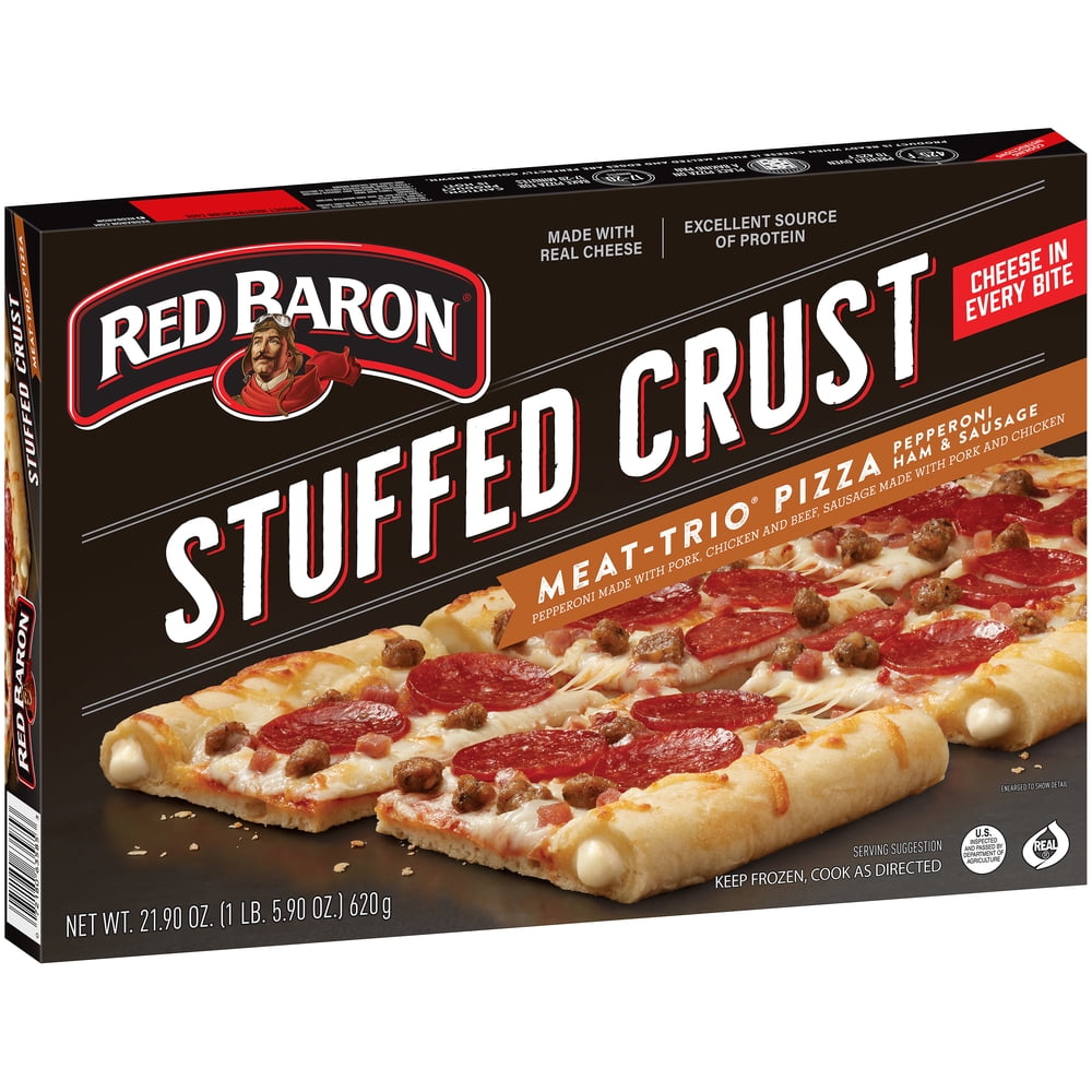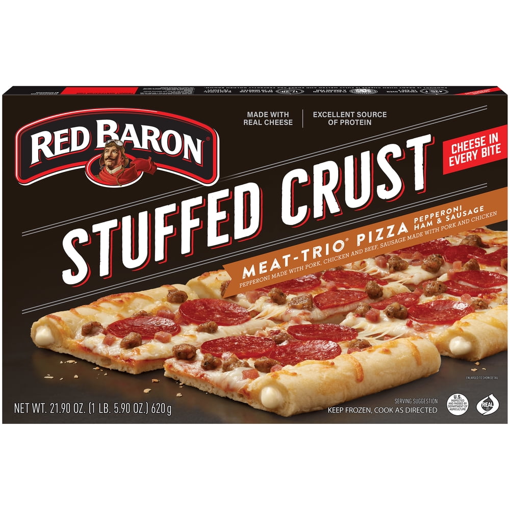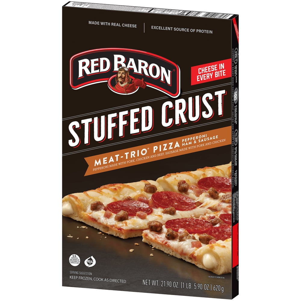 - RED BARON Stuffed Crust MEAT-TRIO Pizza is made with zesty tomato sauce, 100% real cheese, and a hearty topping of pepperoni, smoked ham and sausage.