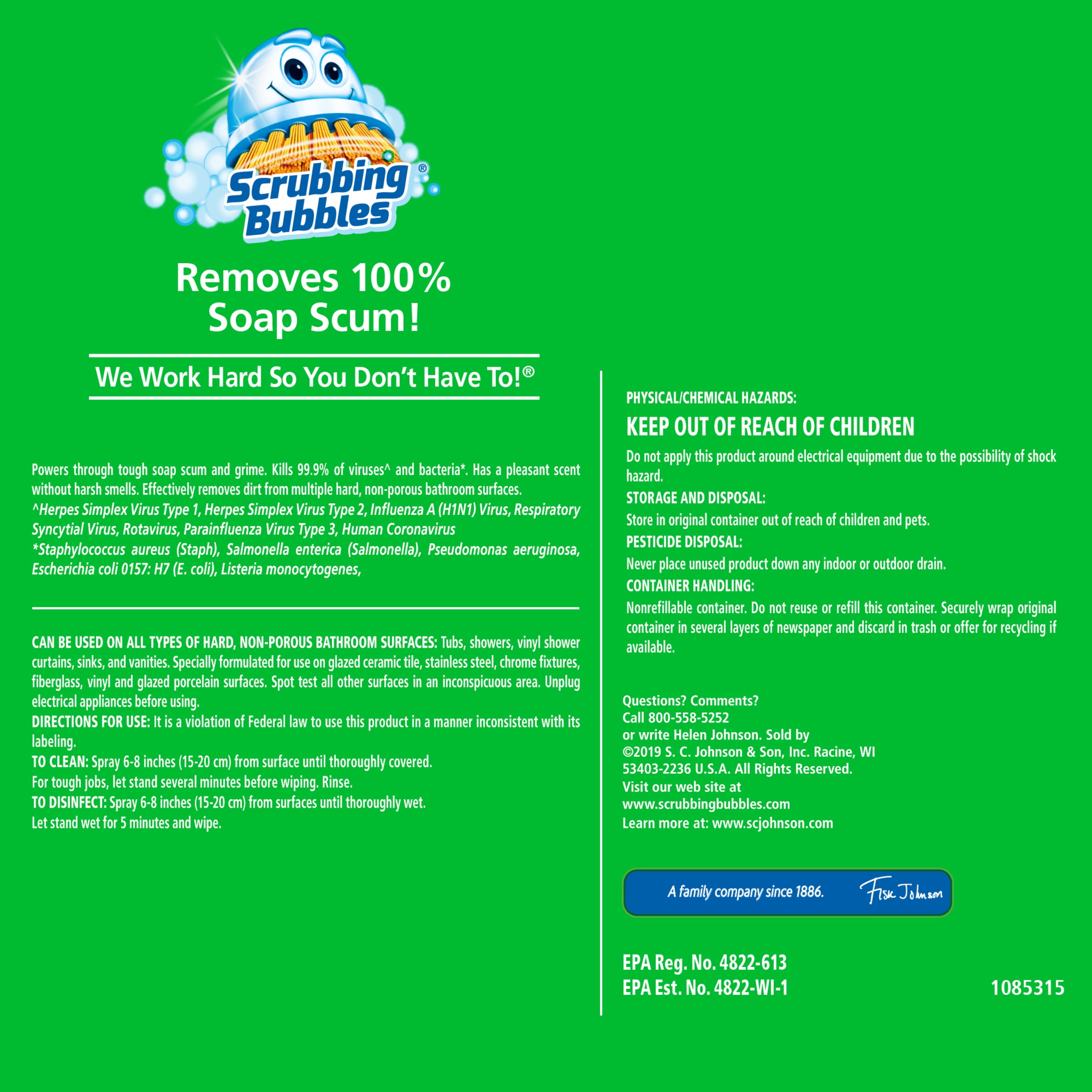 - Scrubbing Bubbles Bathroom Grime Fighter Spray is a disinfectant cleaner with a penetrating foam that takes on grime wherever it hides and kills 99.9% of viruses^ and bacteria*