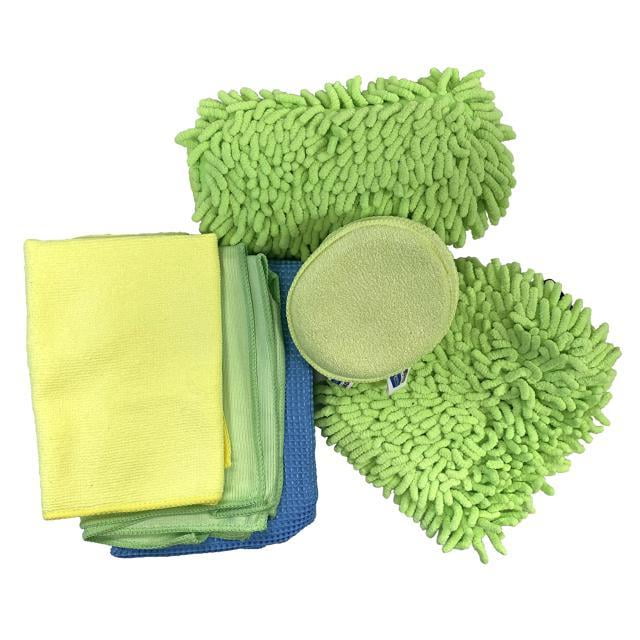 2 pk windshield & glass cloth, 1 waffle weave drying cloth, knobby sponge with scrubber, 2 in 1 wash mit with scrubber, 1 polishing towel, 2pk applicator pad, 1 storage case
