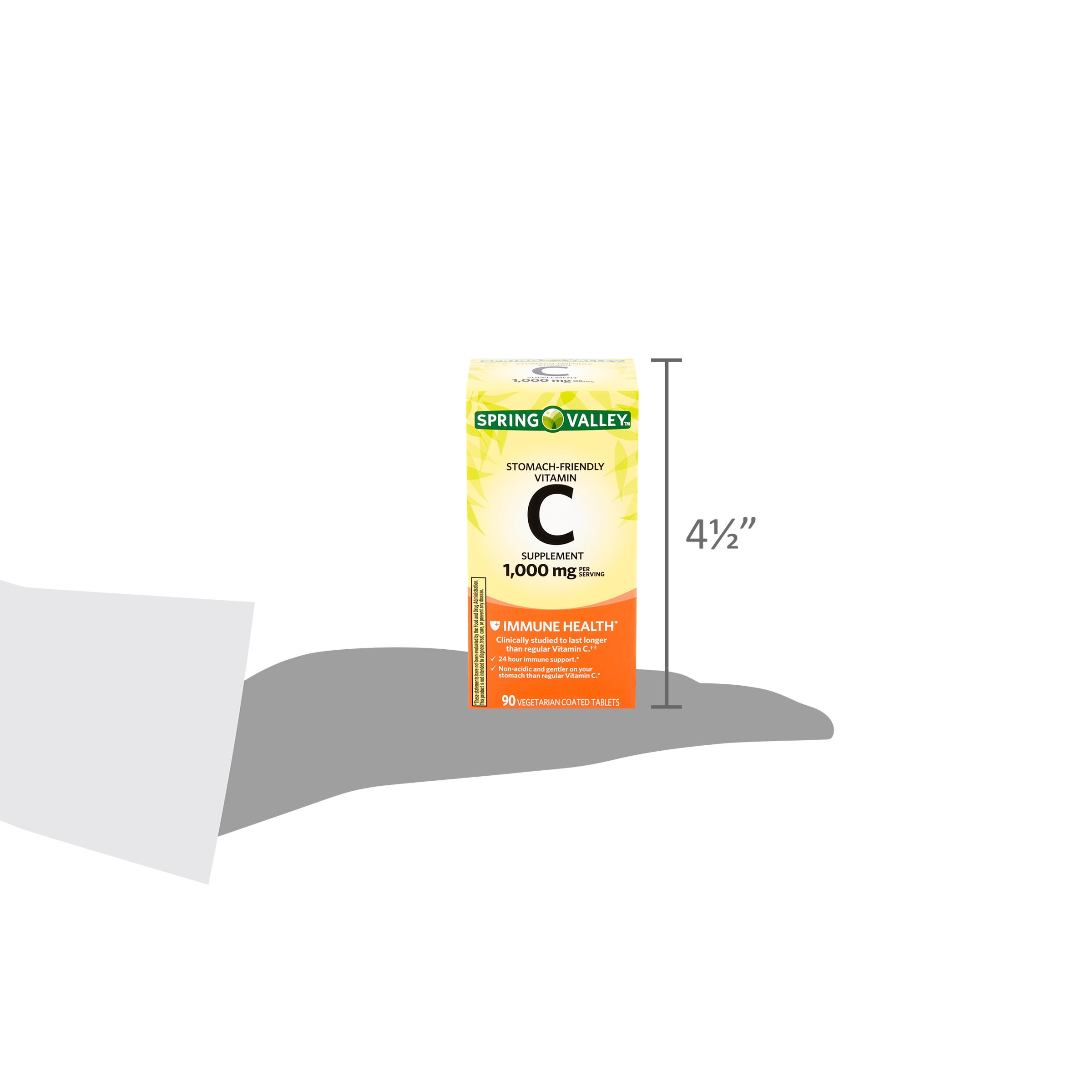 Our Spring Valley Stomach-Friendly Vitamin C Supplement, 1,000 mg uses a unique immune health ingredient that stays in your system for 24 hours. Our supplement is carefully formulated to contain naturally-occurring metabolites to enhance the retention of vitamin C by your white blood cells, a vital component of your immune system. The suggested adult dosage is simply two caplets daily, preferably with a meal. These caplets are free from gluten, yeast, wheat, milk and milk derivatives, lactose, sugar, soy, artificial color, artificial flavor, and preservatives. You can rest assured that our Spring Valley Stomach-Friendly Vitamin C Supplement, 1,000 mg is produced with strict quality guidelines and is backed by our quality guarantee.