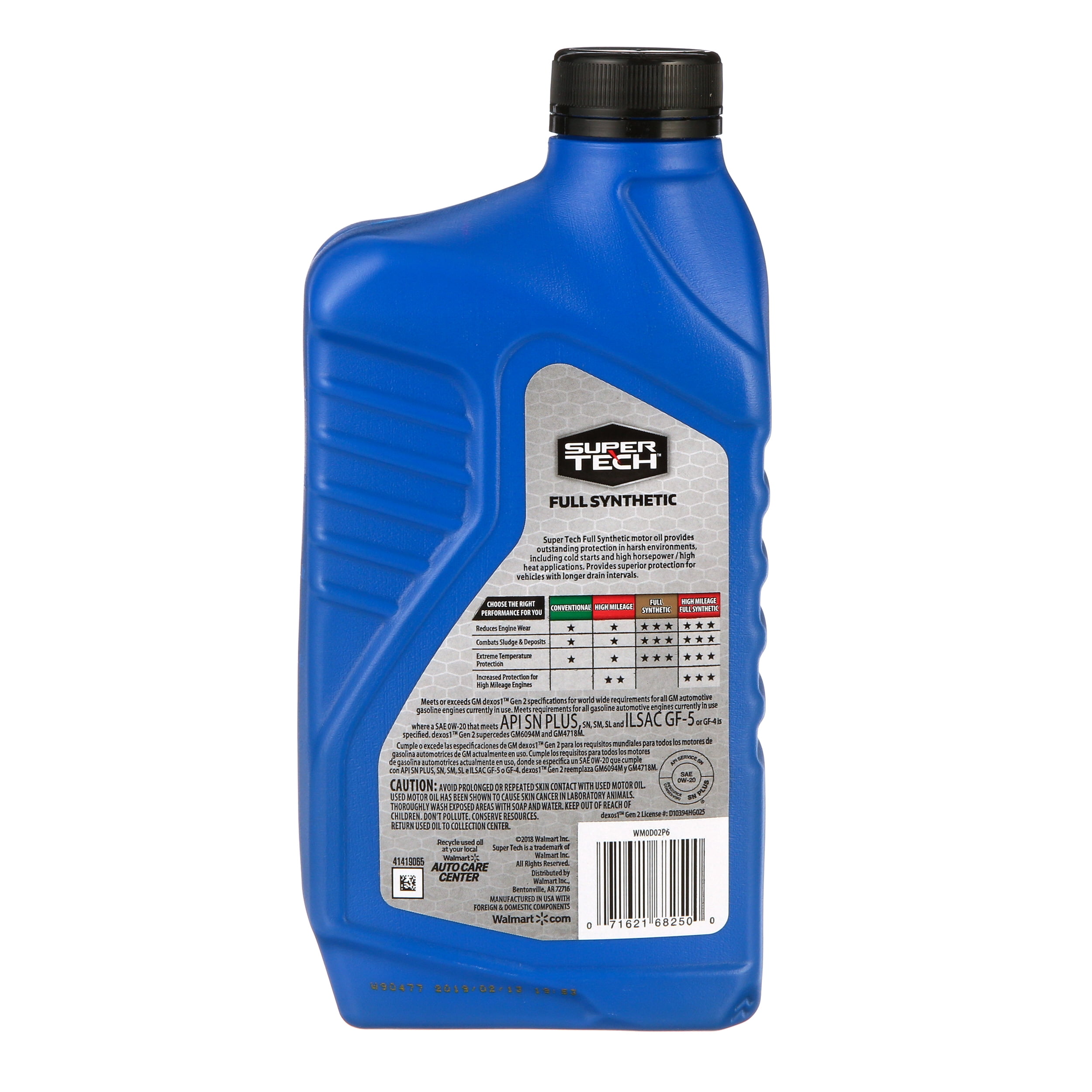 Super Tech Full Synthetic 0W-20 Motor Oil offers 10,000 mile superior wear protection to keep your vehicle performing well. Super Tech Full Synthetic 0W-20 motor oil comes in a quart bottle. This Super Tech Full Synthetic 0W-20 motor oil is made with a combination of premium base oils and an enhanced additive system to provide increased protection for your engine. It features a high-performance formulation for gasoline engines so that yours can function smoothly and efficiently. This Super Tech motor oil provides 10,000 mile superior wear protection and outstanding resistance to thermal breakdown at operating temperatures. It also helps to reduce harmful deposits and acids that can damage your engine and other components and rob them of their power. Super Tech Full Synthetic Motor Oil is compatible with conventional engine oils. Meets or exceeds GM Dexos1 Gen2 specifications for world wide requirements for all GM automotive gasoline engines currently in use. Meets requirements for all gasoline automotive engines currently in use where a SAE 0W-20 that meets API Specifications SP and ILSAC GF-6A or previous standards are specified. Always check manufacturers’ recommendations for proper SAE grade and API classification. Dexos1 Gen2 supercedes GM 6094M and GM4718M. Also available in a quart bottle. Pour it in and help your vehicle continue to perform at a high level.