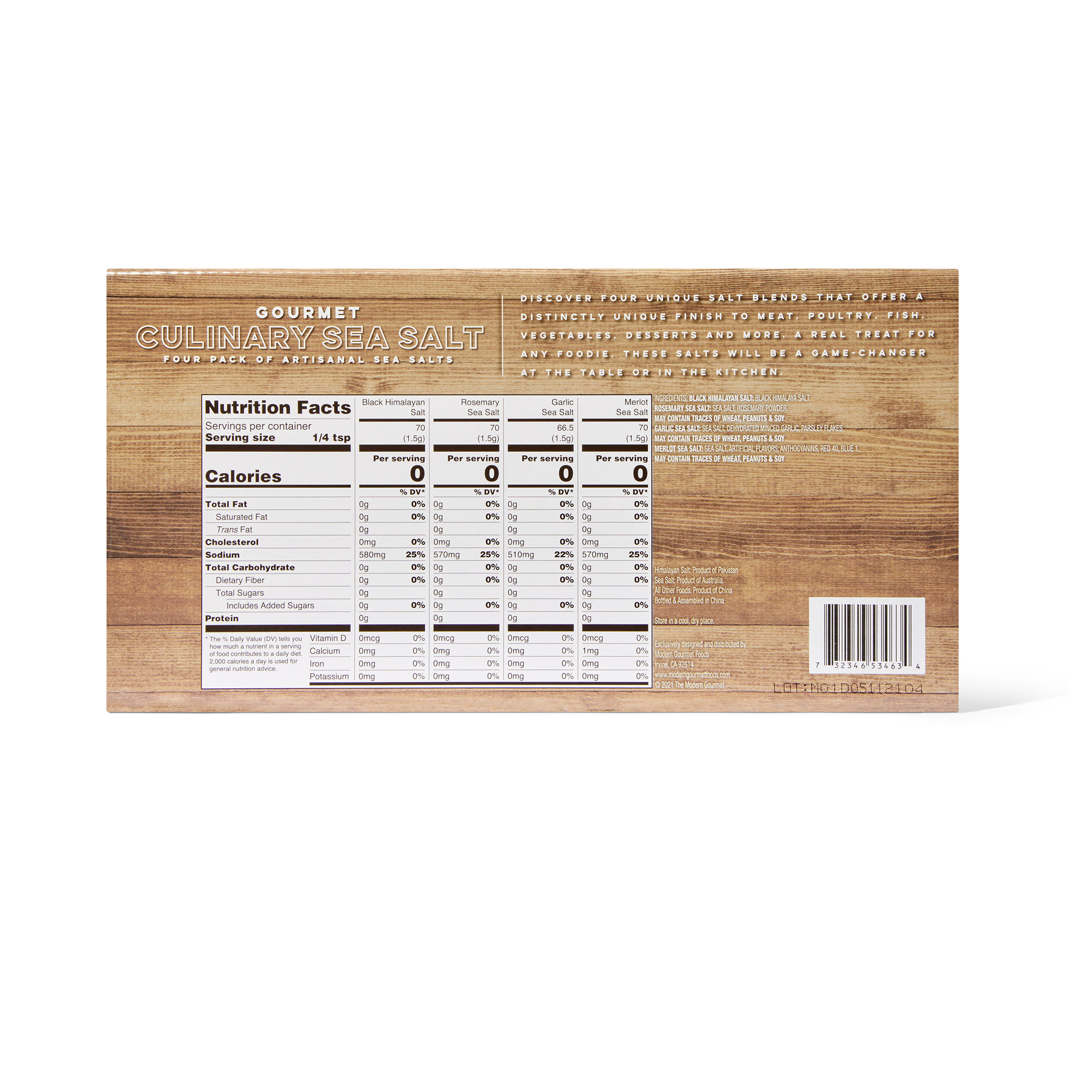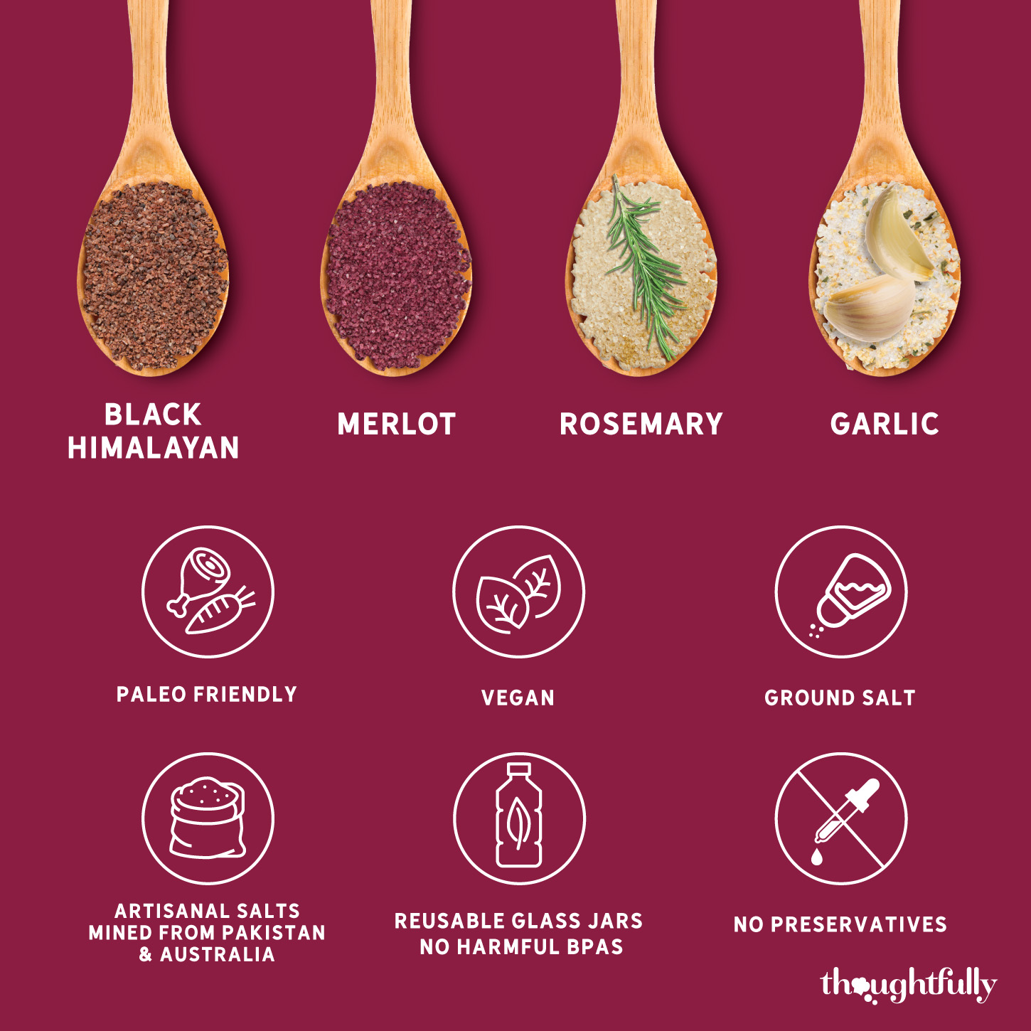 - GOURMET CULINARY SALT set includes four uniquely flavored gourmet seasoning salts in glass jars