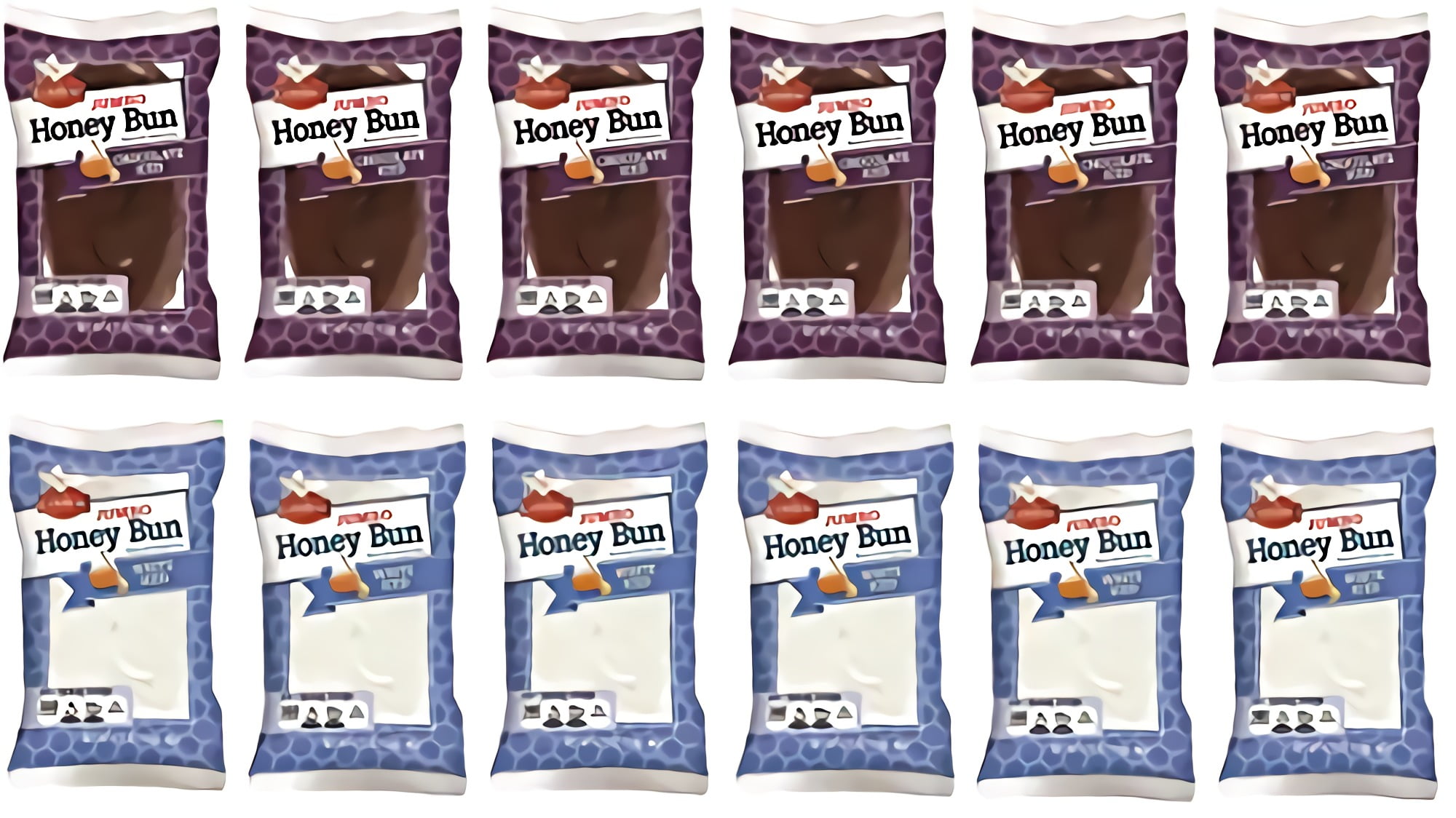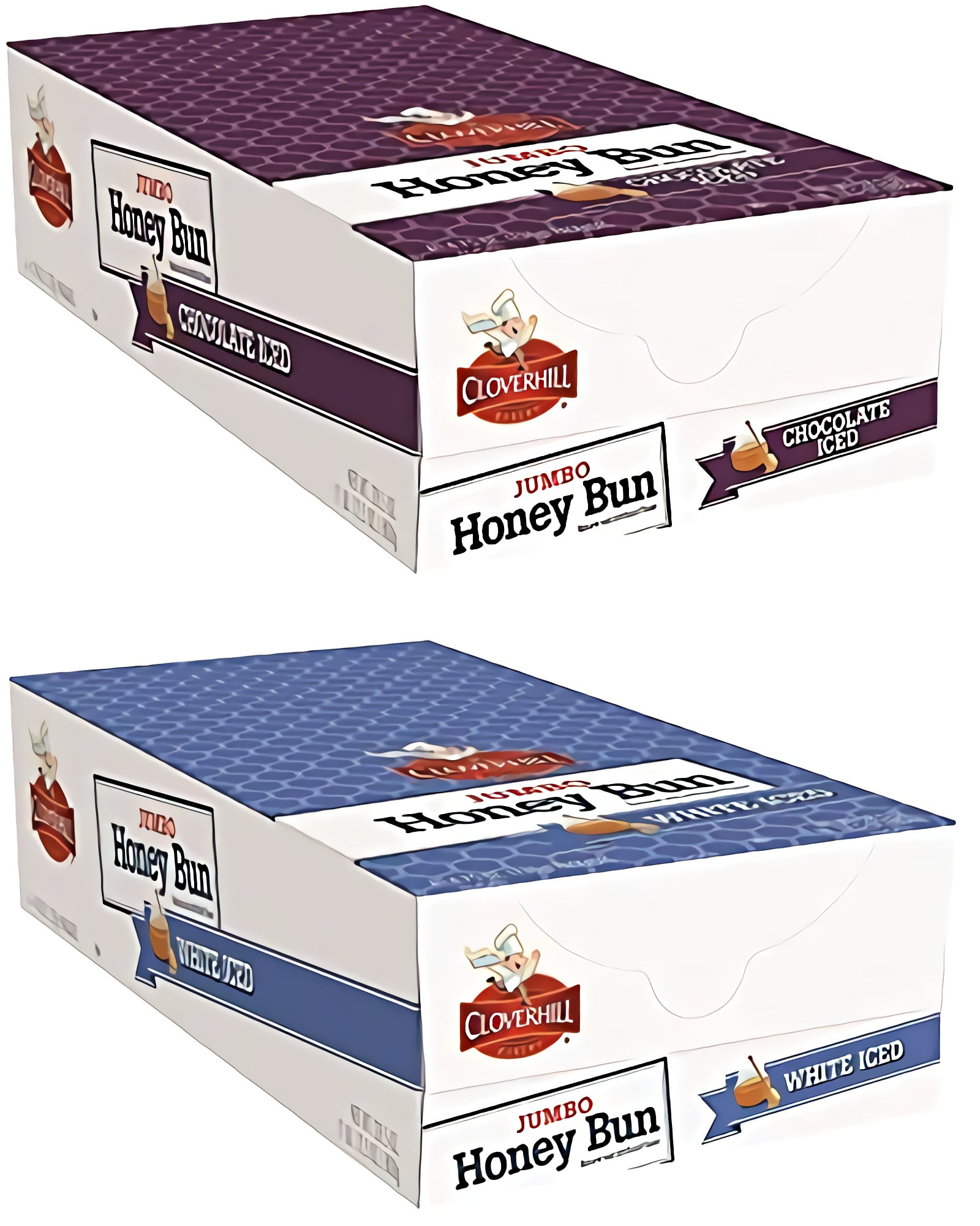 Contains one 6 count box of 4.75 ounce Cloverhill Jumbo Chocolate Iced Honey Buns and one 6 count box of 4.75 ounce Cloverhill Jumbo White Iced Honey