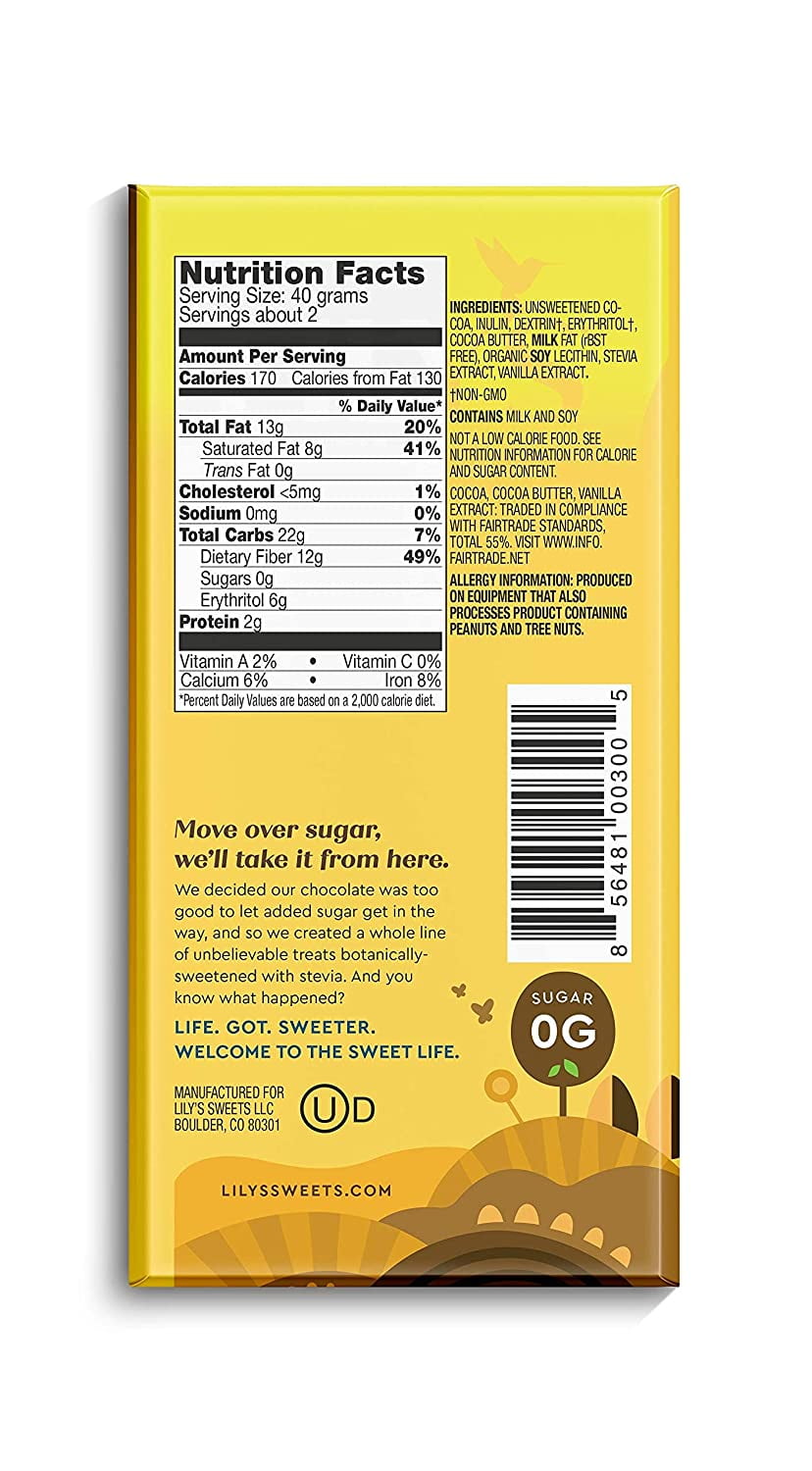 Low carb, Keto Diet friendly premium dark chocolate (55% Cocoa) Botanically Sweetened with a Stevia Blend – Stevia is a zero calorie botanical sweetener. It is derived from the plant Stevia Rebaudiana. Stevia has sweetened foods and beverages for centuries. Our use of Stevia gives Lily’s natural a richness and less sugar than typical chocolates. Use of Fair Trade, Gluten-Free and Non-GMO Ingredients 3 ounce, 4-PackLily’s stevia-sweetened chocolate has all the indulgence you crave but with a lot fewer calories. We use only the finest non-GMO ingredients, including genuine, Fair Trade certified cocoa. As an extra bonus, all Lily’s bars and baking chips are now certified gluten-free. At Lily’s we’re committed to making great tasting chocolate better for you.