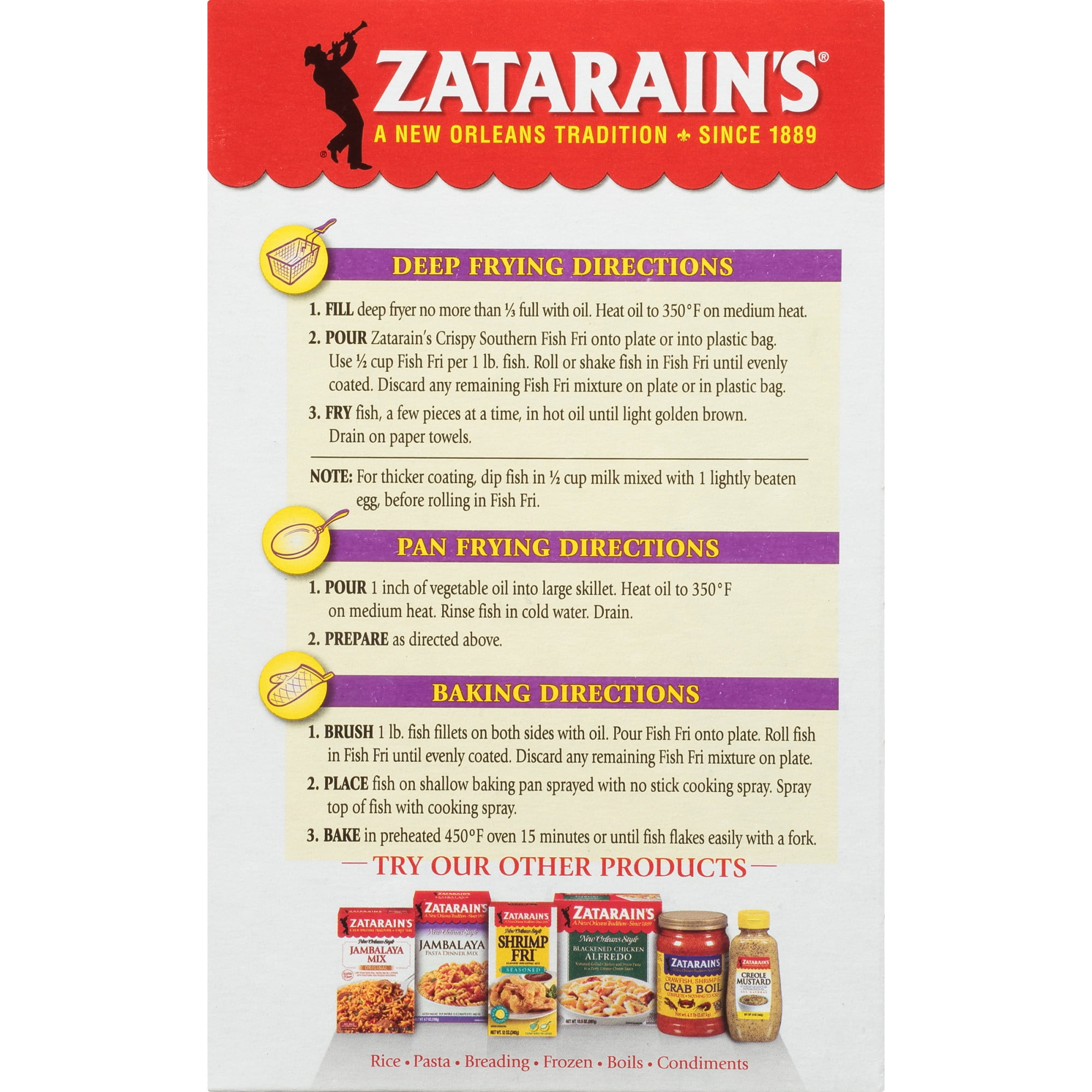 Zatarain’s Crispy Southern Fish Fri is the secret to crispy and delicious Southern-style fried fish. This perfectly seasoned seafood breading is made with yellow corn meal, real lemon juice, and savory garlic, onion and spices. Crispy Southern Fish Fri is all you need to prepare an authentic Louisiana fish fry. Simply roll or shake fish in the breading mix, then cook as desired – fry in a deep fryer, pan fry in a skillet or bake in the oven – until the crust is light golden brown and the fish is moist and tender on the inside. Great for tilapia, catfish or shrimp cakes. For a heartier coating, moisten the fish first in a milk-and-egg mixture. Or, for bold New Orleans flavor, coat with Zatarain’s Creole Mustard before rolling in the Fish Fri.