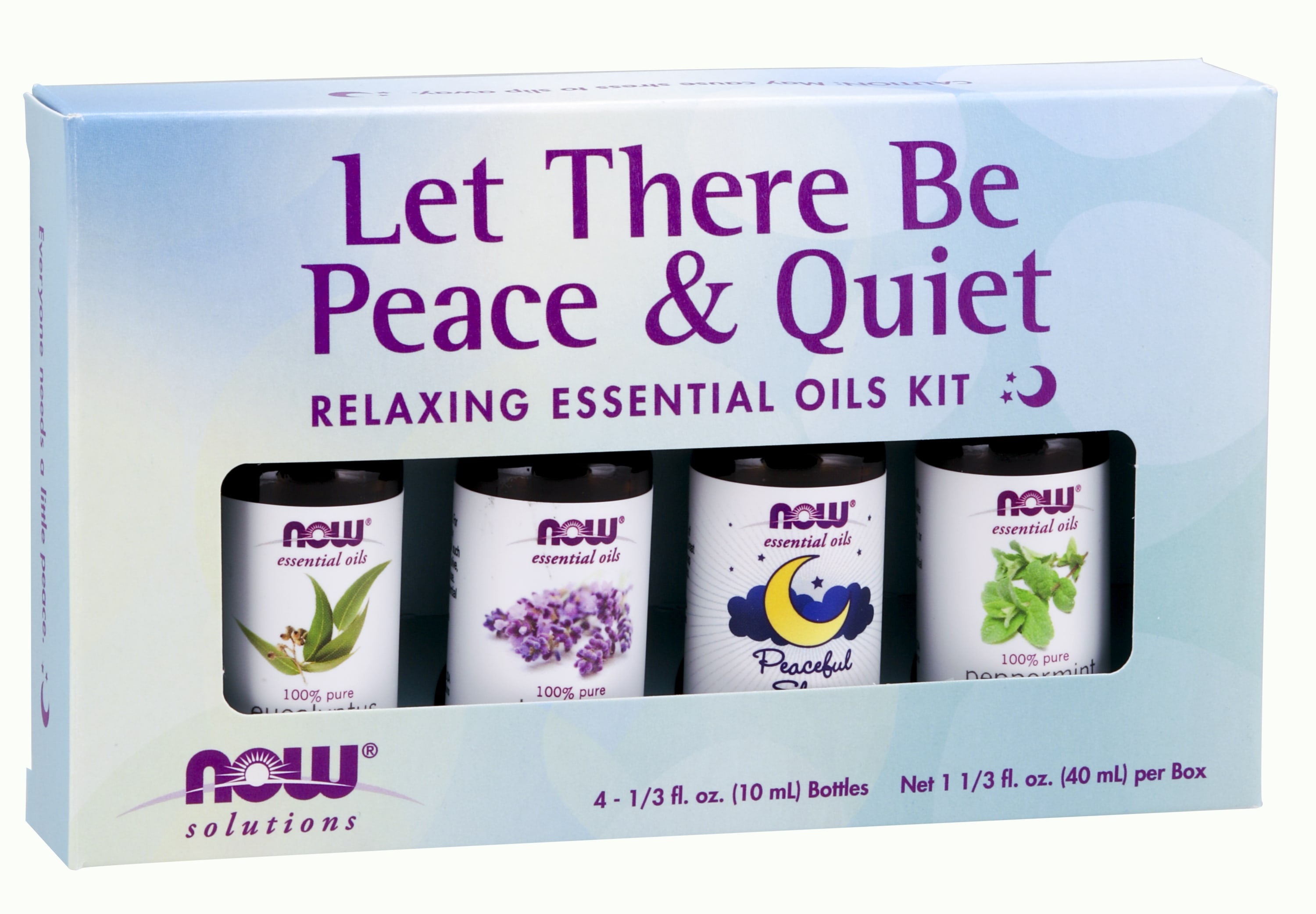 NOW Essential Oils, Let There Be Peace & Quiet Aromatherapy Kit, 4x 10ml Including Lavender Oil, Peppermint Oil, Eucalyptus Oil and Peaceful Sleep Oil Blend With Child Resistant Caps